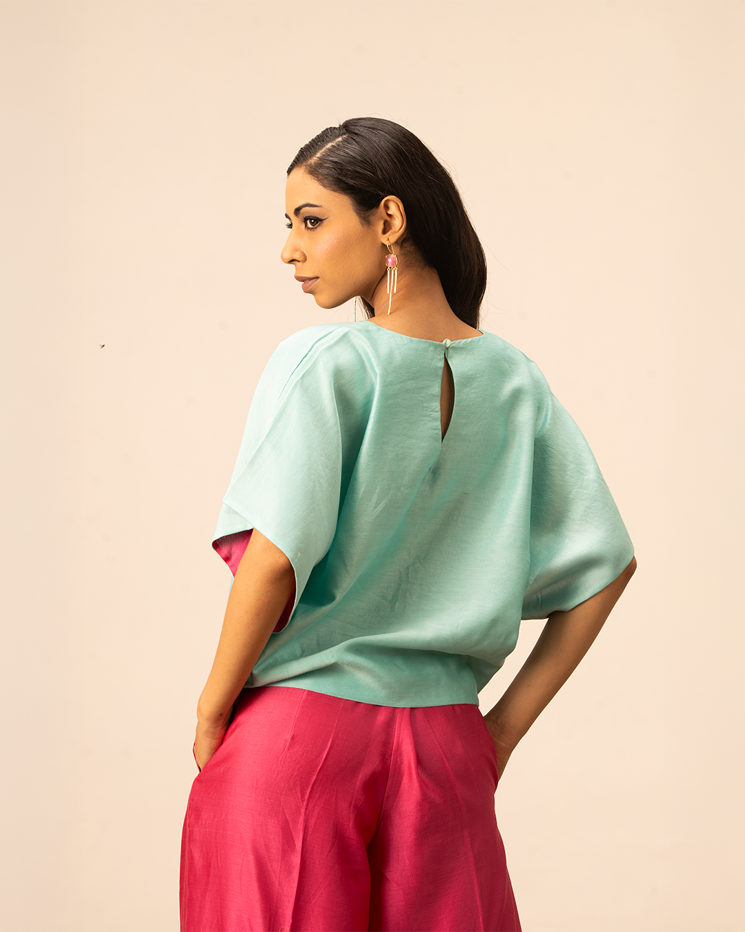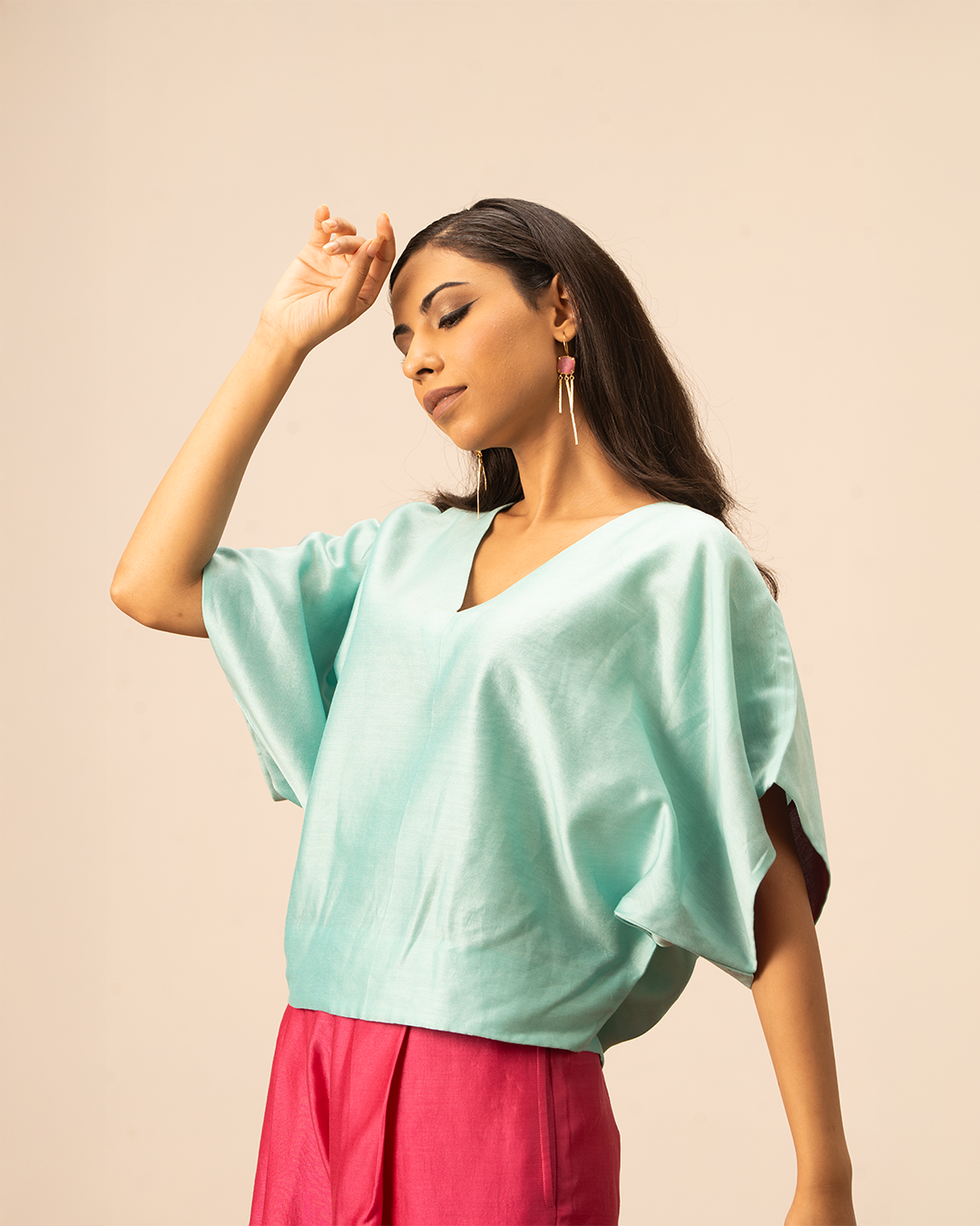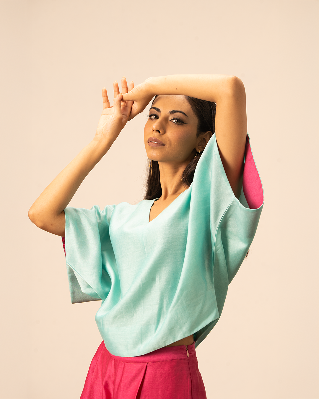 Stay effortlessly chic with Aria Kaftan Top, featuring a flattering V-neckline and a delicate keyhole button closure at the back. Lightweight and breezy in pure chanderi in aqua blue with pink contrasting border, it offers comfort and a graceful silhouette. Perfect for festive gatherings, casual outings, and evening events, it pairs seamlessly with palazzo pants, skirts, or contemporary bottoms. A versatile piece that blends modern style with timeless elegance.
