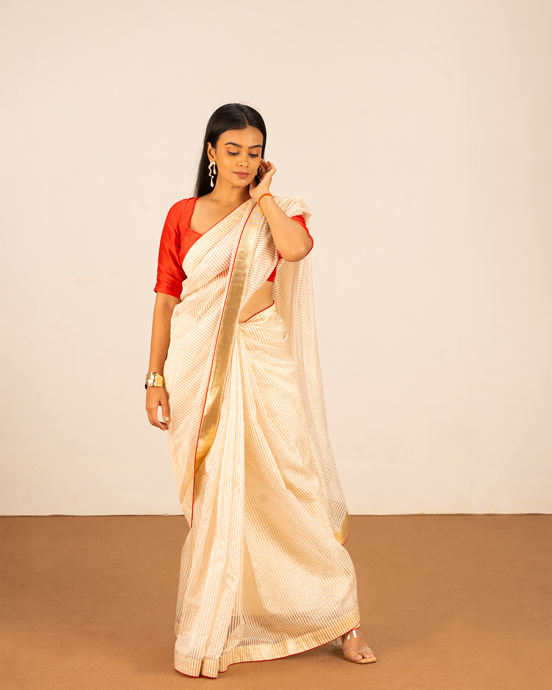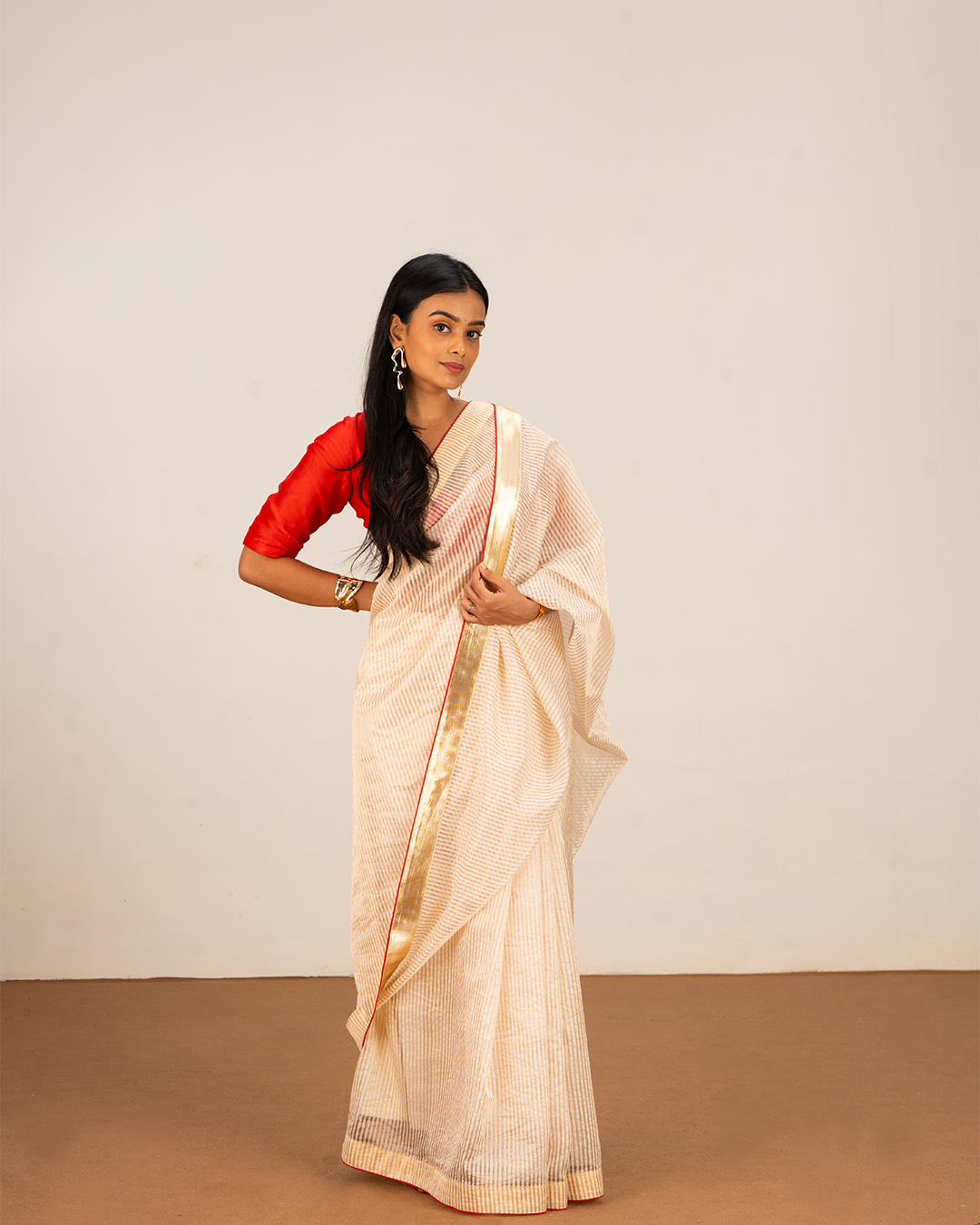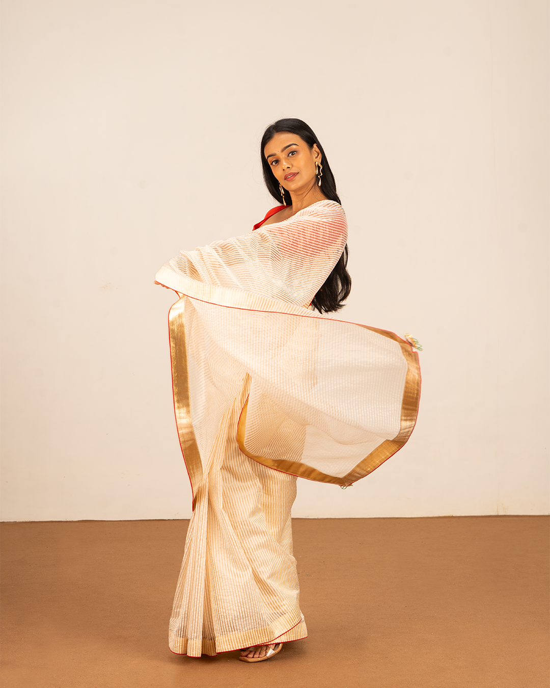 Step into elegance with the Aura Saree, crafted in pure chanderi tissue with delicate, luminous golden vertical stripes that shimmer gracefully. The saree features a classic gota border accented with red piping, adding a subtle, feminine touch. Lightweight and flowing, it exudes effortless sophistication for festive occasions, evening events, and cultural celebrations. A perfect blend of traditional craftsmanship and contemporary design, this saree makes a timeless statement.