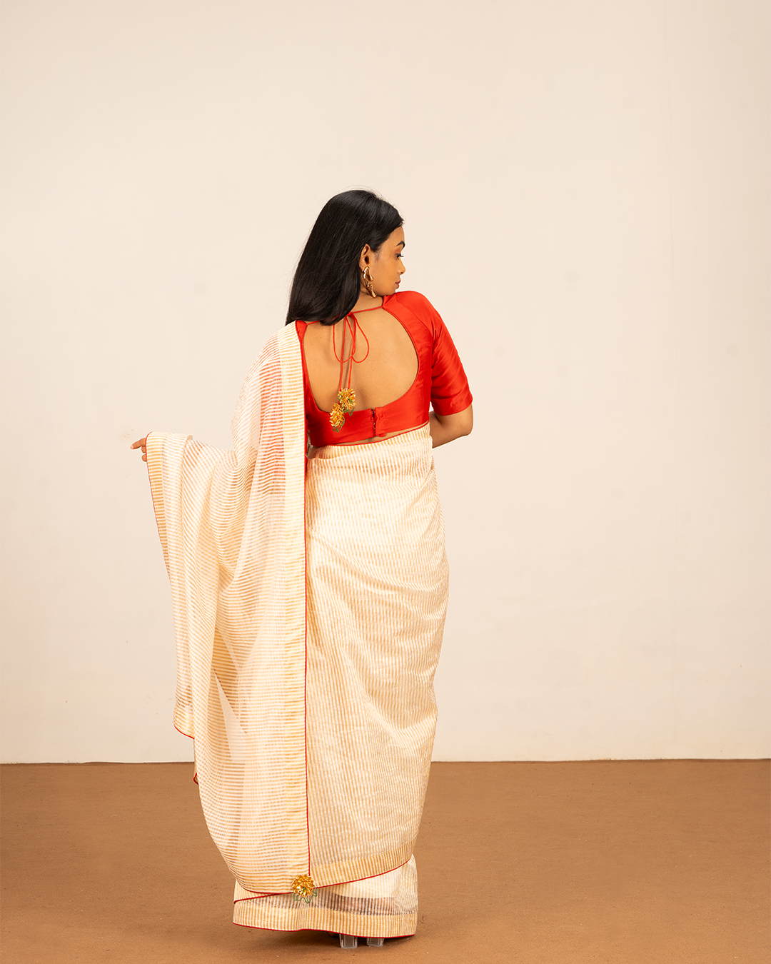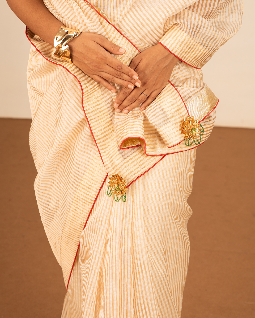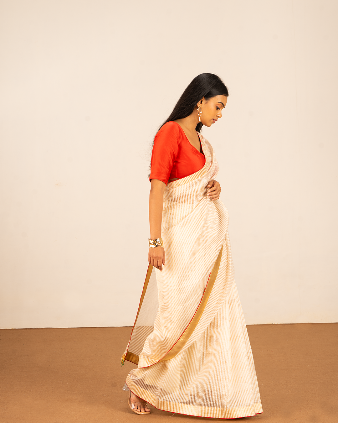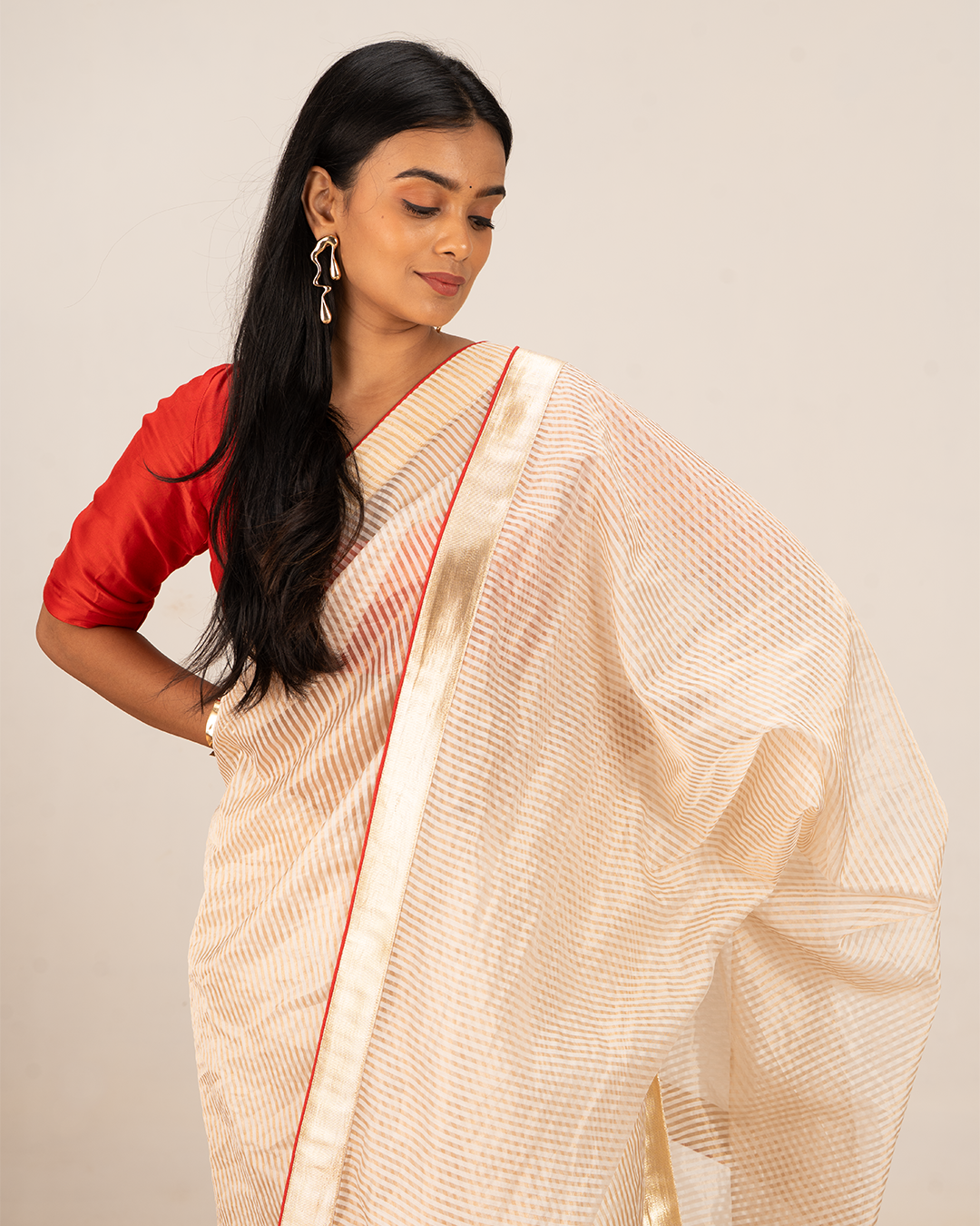 Step into elegance with the Aura Saree, crafted in pure chanderi tissue with delicate, luminous golden vertical stripes that shimmer gracefully. The saree features a classic gota border accented with red piping, adding a subtle, feminine touch. Lightweight and flowing, it exudes effortless sophistication for festive occasions, evening events, and cultural celebrations. A perfect blend of traditional craftsmanship and contemporary design, this saree makes a timeless statement.