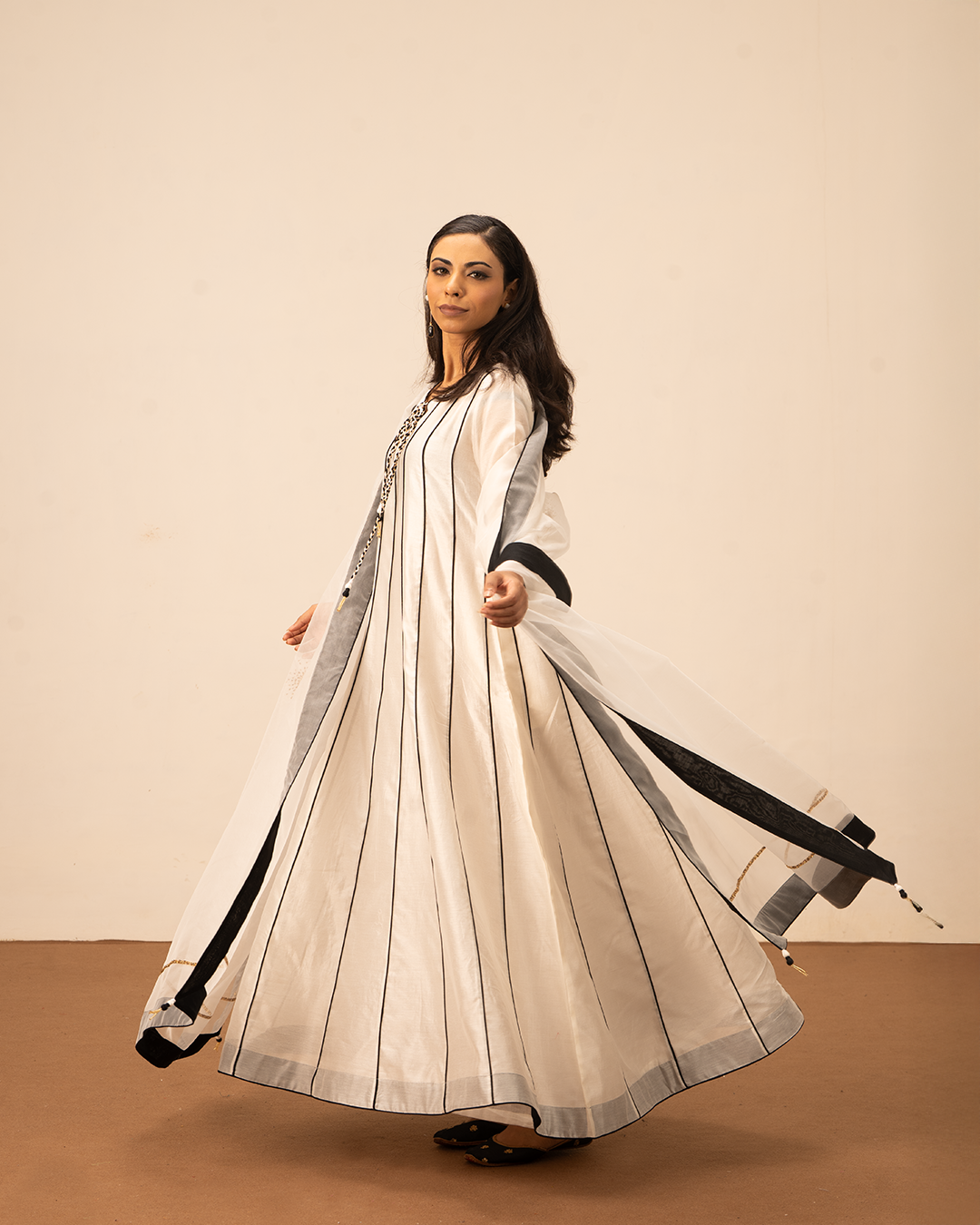 The Aven Anarkali Kurta is crafted in soft, lightweight pure chanderi fabric with vertical stripes that enhance its graceful, flowy silhouette. Featuring a round neckline and elegant tie-up detail, it is paired with an organza dupatta adorned with delicate hand embroidery and tassels. Designed for comfort and sophistication, this ensemble is perfect for festive occasions, evening events, and cultural celebrations. A refined choice that beautifully blends traditional craftsmanship with contemporary style.