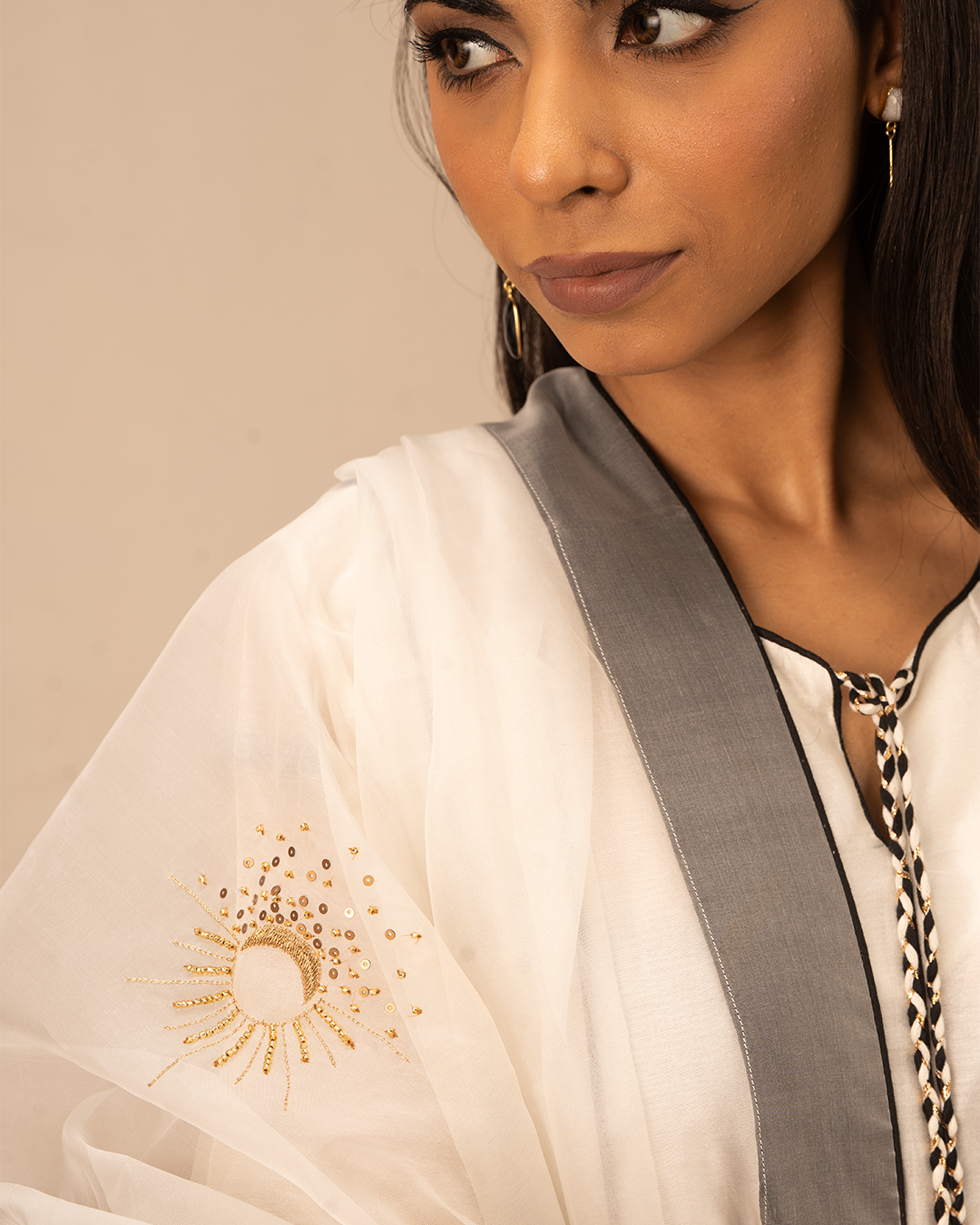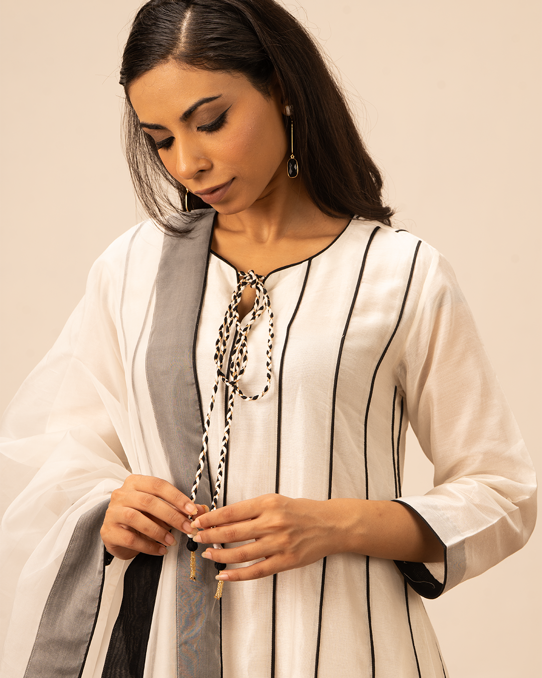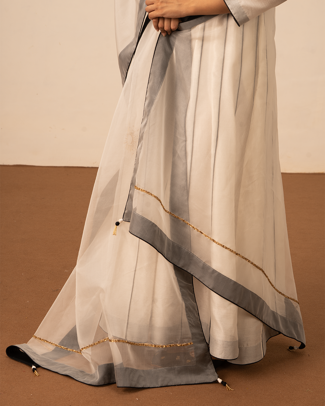 • Knotted tie-ups in front of black, white and golden gota with handmade tassels