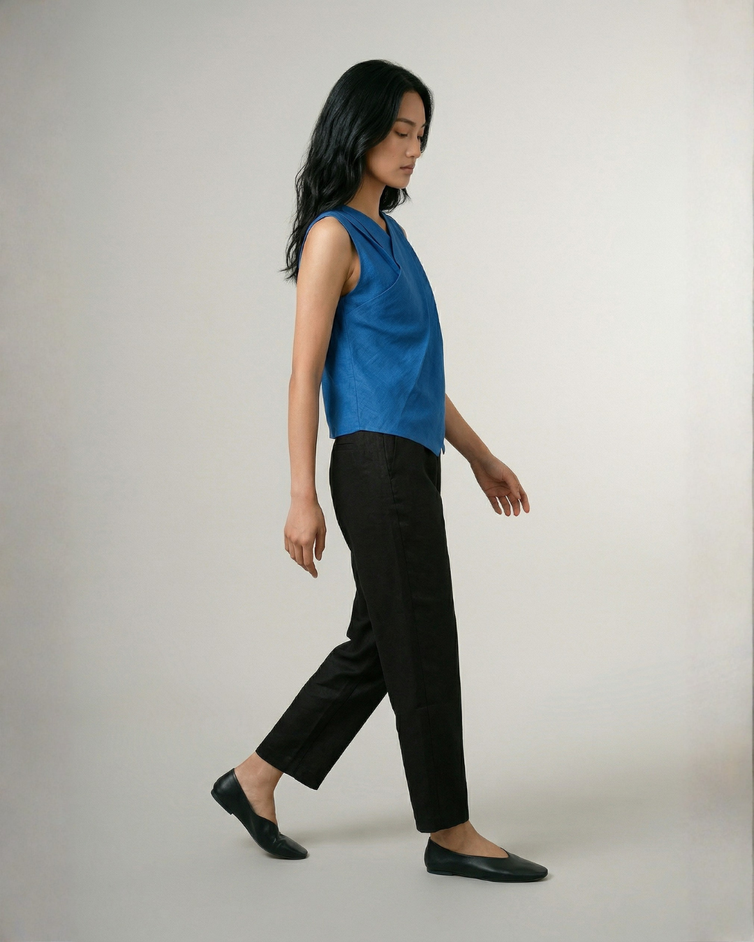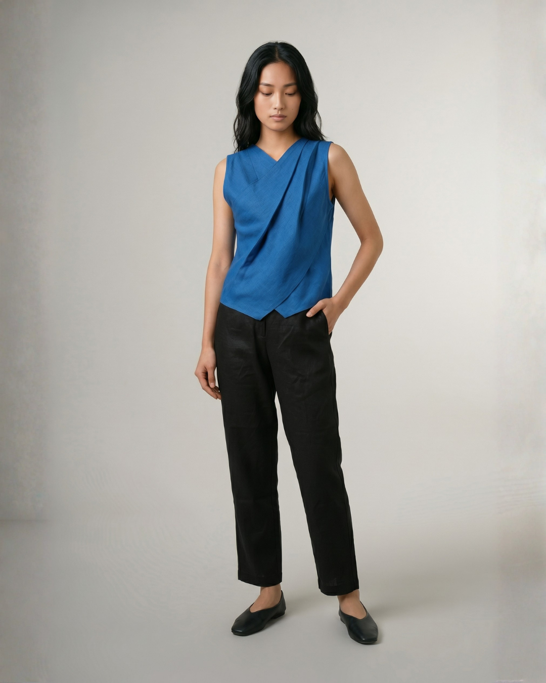 The Crossline Linen Coord Set is defined by clean lines and quiet structure, minimal, modern, and effortlessly composed. Crafted in a breathable linen-cotton blend, it feels light on the skin while holding a natural, easy form. The top features a V-neckline with cut sleeves and an asymmetrical hem that adds a subtle edge to its silhouette. Paired with regular fit tapered pants, the set balances structure with everyday ease.