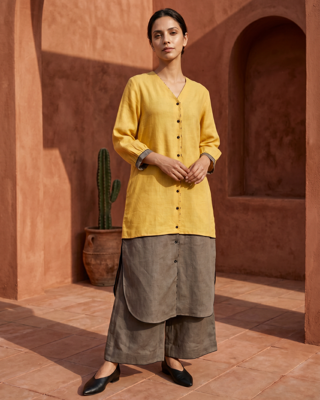 The Driftblock Kurta Set brings together warmth and depth in equal measure, balanced yet expressive in its presence. Crafted in a breathable linen-cotton blend, it moves with ease while holding its structure. The shirt features a V-neckline with delicate hand embroidery, paired with puffed quarter sleeves that add a gentle volume. Designed in an A-line relaxed fit, it flows effortlessly, complemented by wide-leg palazzo pants that offer comfort and movement.