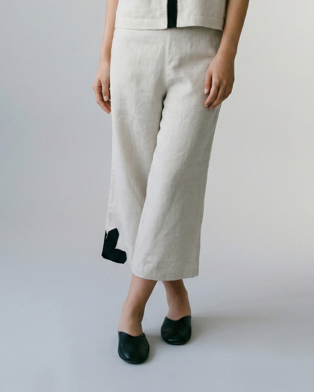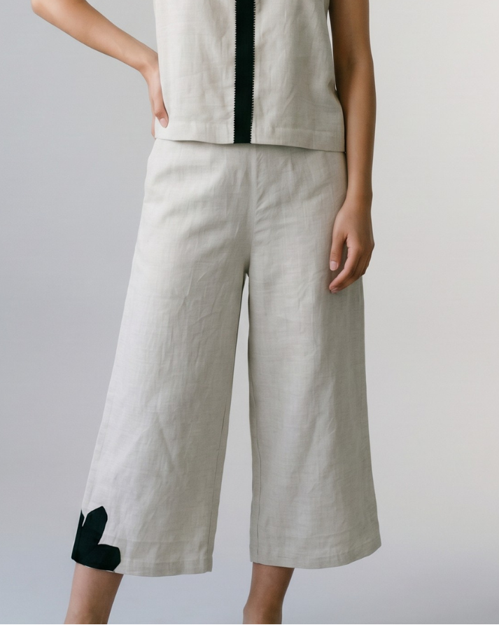 The Dune Linen Pants are rooted in quiet ease, relaxed, airy, and effortlessly composed. Crafted in a breathable linen-cotton blend, they feel light on the skin while holding a soft, natural structure. Designed in a relaxed culotte fit, they offer a wide, easy silhouette that moves freely through the day. The half-elasticated waistband ensures comfort, while pockets on both sides bring in everyday functionality.