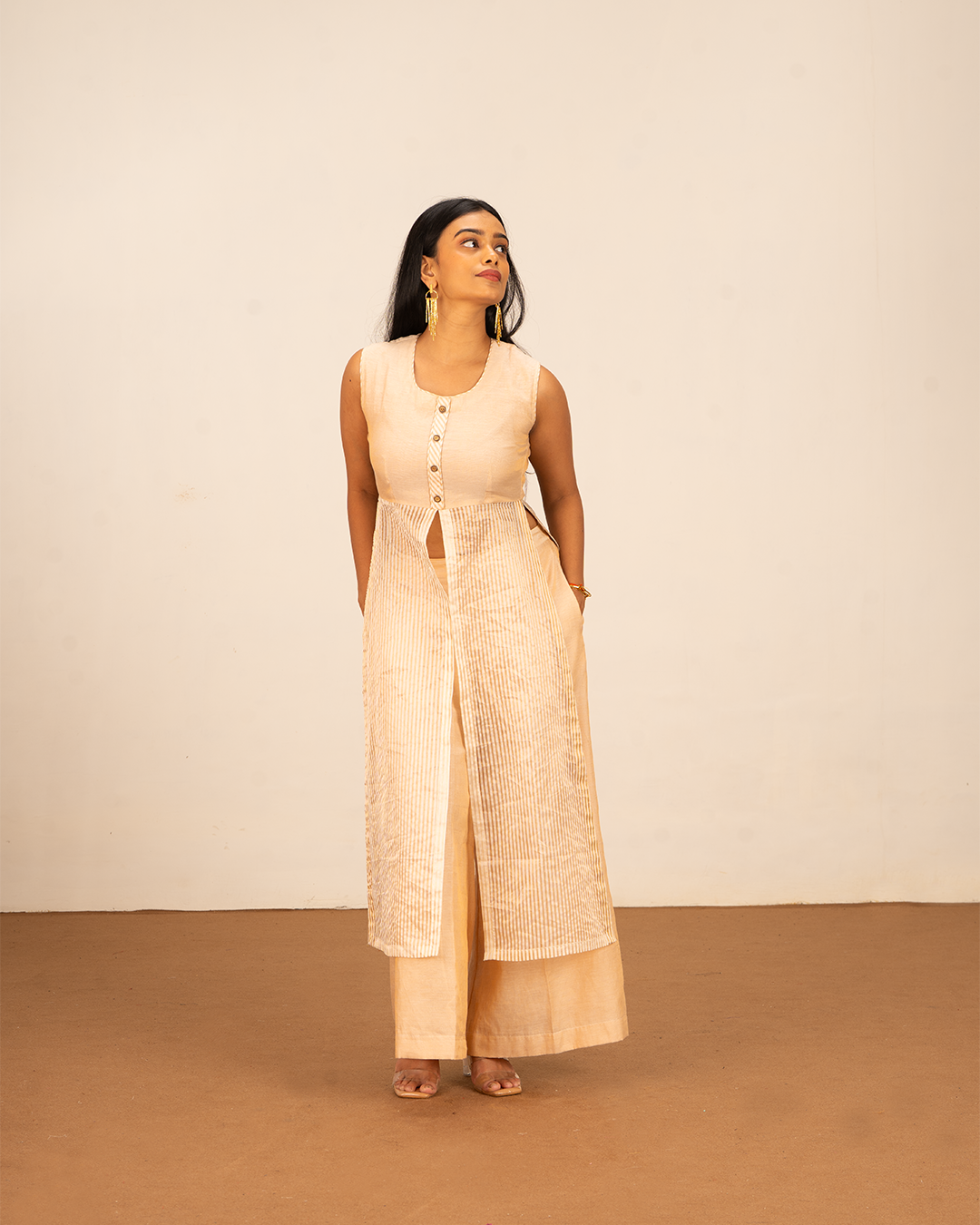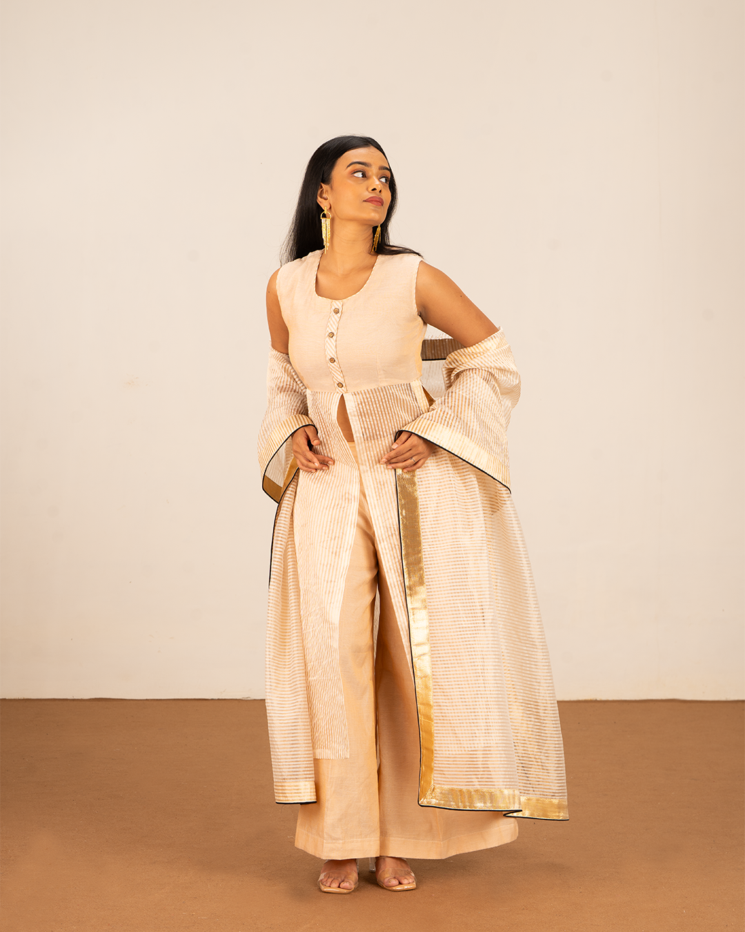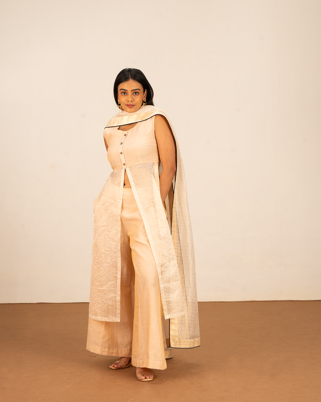 The Eira Kurta Set is crafted in pure chanderi tissue, featuring a sleeveless round neckline with delicate front and side slit openings. The longline kurta is detailed with subtle buttons and paired with flared pants and a lightweight striped dupatta finished with a gold border. Lightweight and graceful, this ensemble offers a timeless blend of structure and fluidity. Perfect for festive soirées, intimate gatherings, and elegant celebrations.