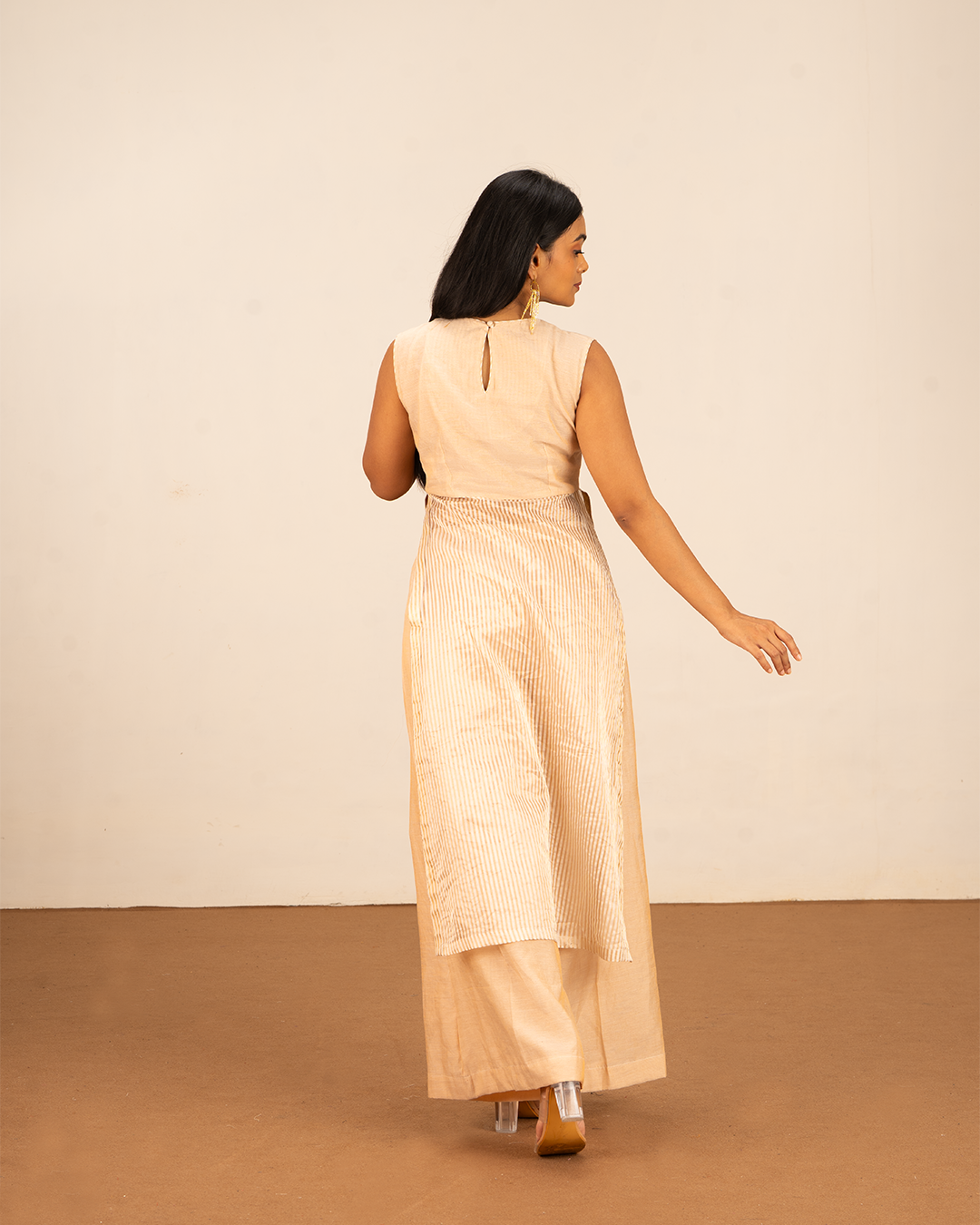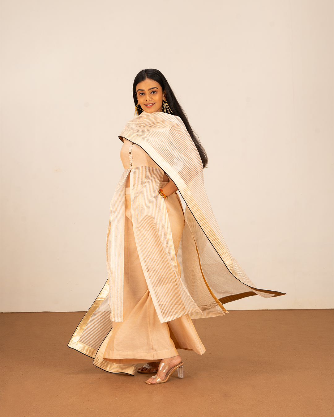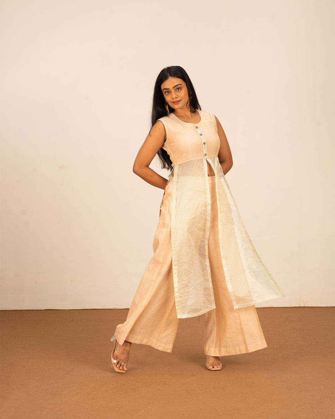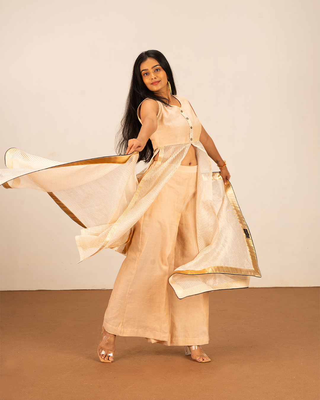The Eira Kurta Set is crafted in pure chanderi tissue, featuring a sleeveless round neckline with delicate front and side slit openings. The longline kurta is detailed with subtle buttons and paired with flared pants and a lightweight striped dupatta finished with a gold border. Lightweight and graceful, this ensemble offers a timeless blend of structure and fluidity. Perfect for festive soirées, intimate gatherings, and elegant celebrations.