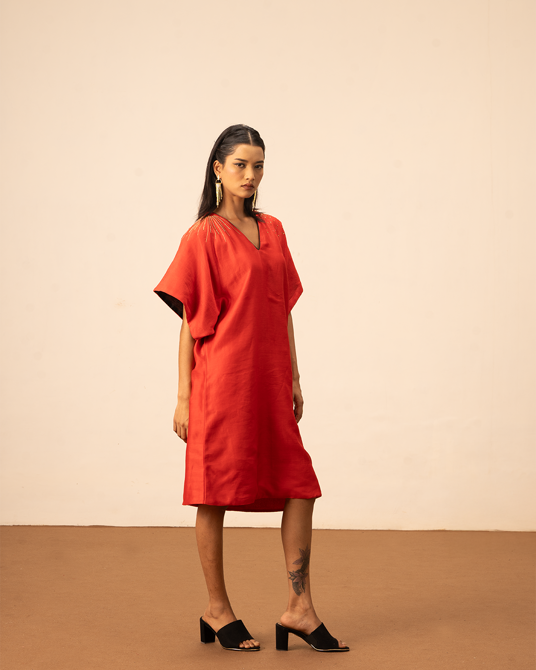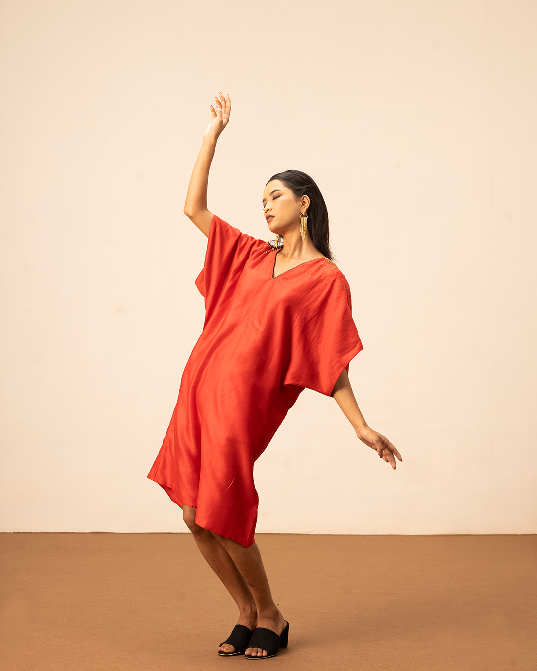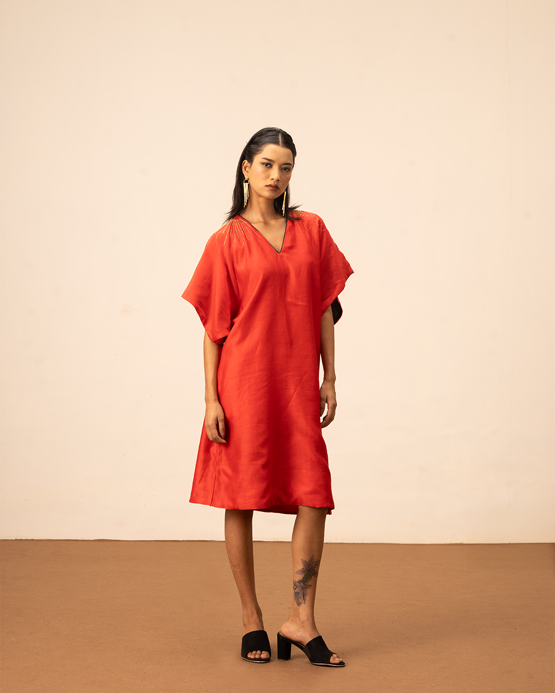 Step into elegance with the Fira Kaftan Dress in bold red with black contrasting border, featuring a relaxed fit and a flattering V-neckline crafted in pure chanderi. The shoulders are adorned with delicate golden beadwork embroidery, complemented by a keyhole button closure at the back. Lightweight and graceful, it offers comfort and sophistication. Perfect for festive occasions, evening gatherings, and cultural celebrations, this dress blends traditional craftsmanship with contemporary style.