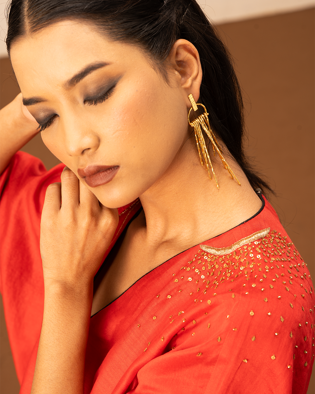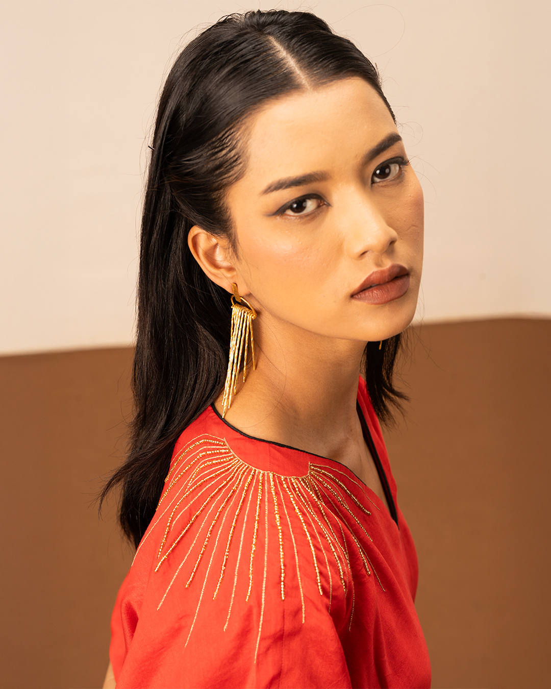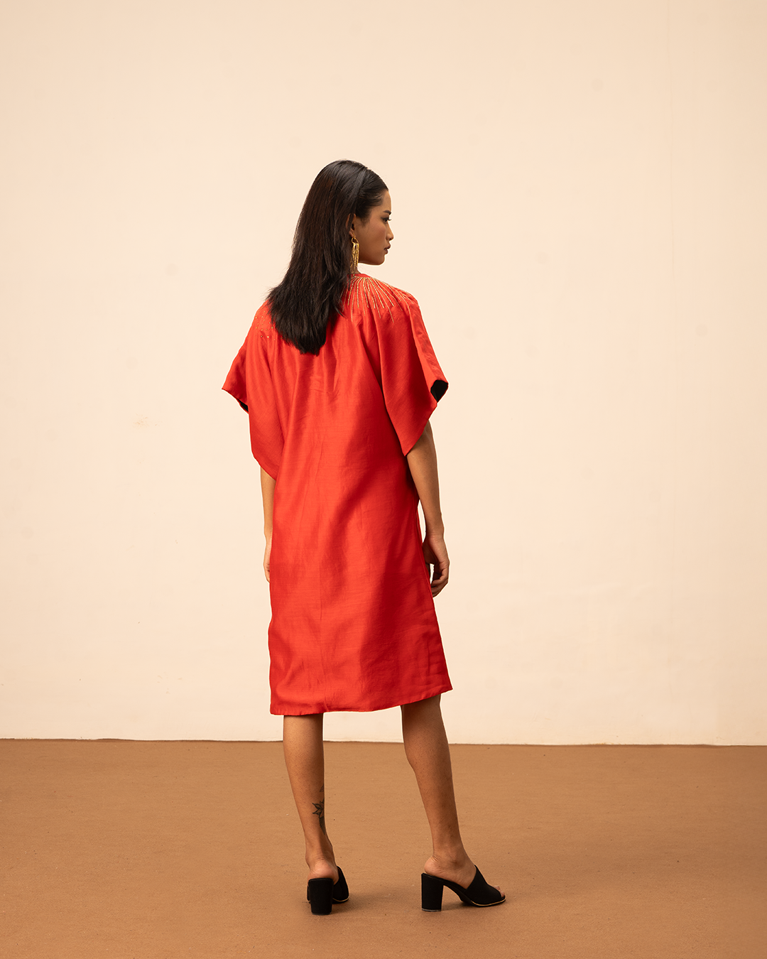 Step into elegance with the Fira Kaftan Dress in bold red with black contrasting border, featuring a relaxed fit and a flattering V-neckline crafted in pure chanderi. The shoulders are adorned with delicate golden beadwork embroidery, complemented by a keyhole button closure at the back. Lightweight and graceful, it offers comfort and sophistication. Perfect for festive occasions, evening gatherings, and cultural celebrations, this dress blends traditional craftsmanship with contemporary style.