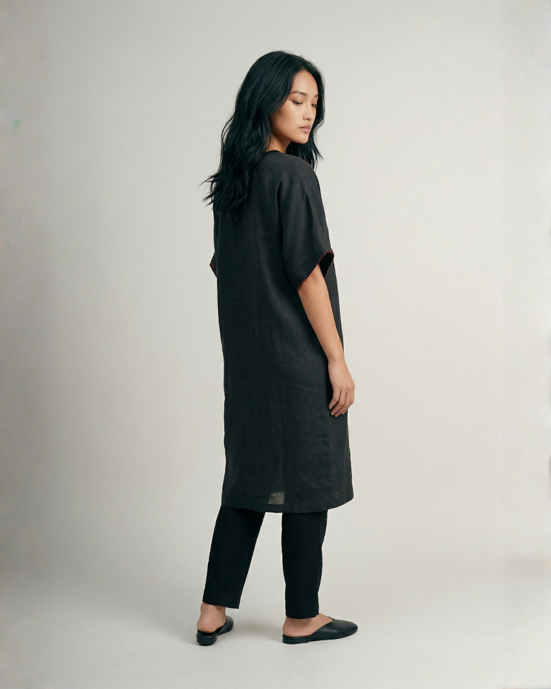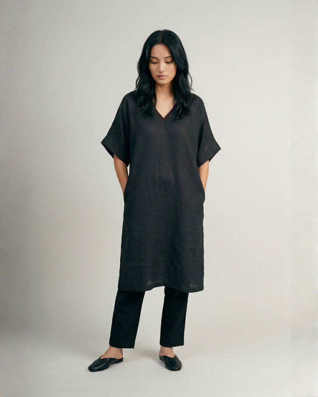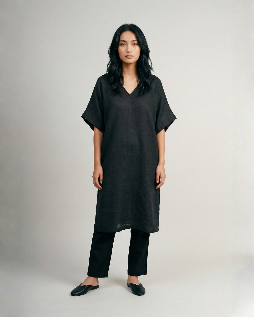 The Flora Kaftan Kurta Set is ease in its most effortless form, fluid, relaxed, and quietly expressive. Crafted in a breathable linen-cotton blend, it drapes softly while holding a gentle structure. The kurta features a V-neckline with delicate hand embroidery, paired with short sleeves that keep the silhouette light and unrestricted. Its relaxed fit flows with ease, complemented by wide-leg palazzo pants that mirror the same comfort and movement. Pockets on both sides of the kurta add a layer of everyday functionality.