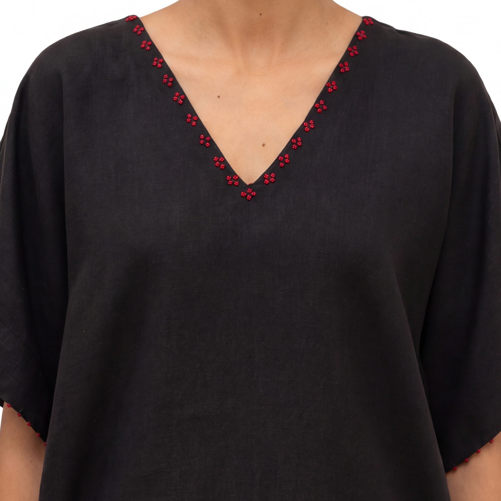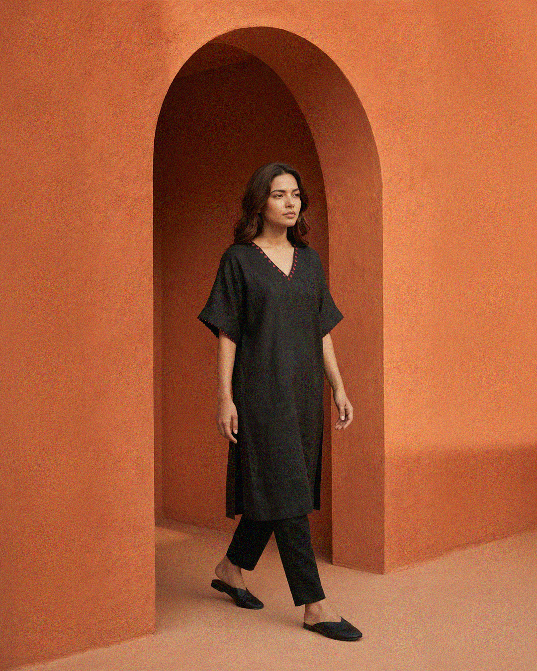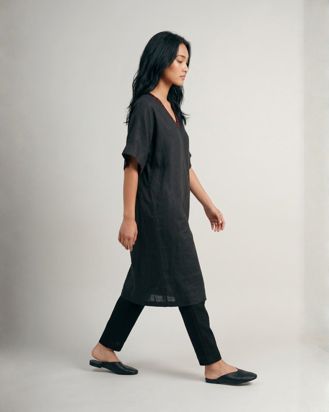 The Flora Kaftan Kurta Set is ease in its most effortless form, fluid, relaxed, and quietly expressive. Crafted in a breathable linen-cotton blend, it drapes softly while holding a gentle structure. The kurta features a V-neckline with delicate hand embroidery, paired with short sleeves that keep the silhouette light and unrestricted. Its relaxed fit flows with ease, complemented by wide-leg palazzo pants that mirror the same comfort and movement. Pockets on both sides of the kurta add a layer of everyday functionality.