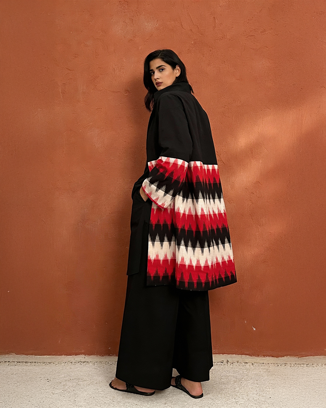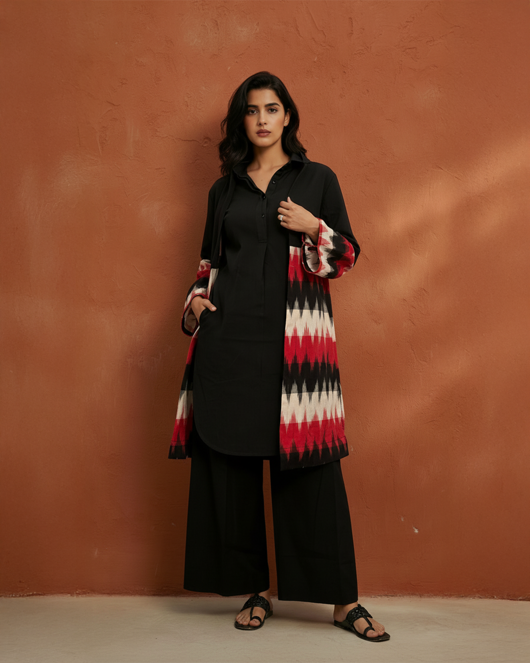 Bold yet refined, the Ikai Ikat Jacket blends classic black with a striking red-and-ivory Ikat border for a powerful statement look. Designed with a clean silhouette and crafted in breathable cotton, this jacket layers effortlessly over kurtas, dresses, or co-ord sets.