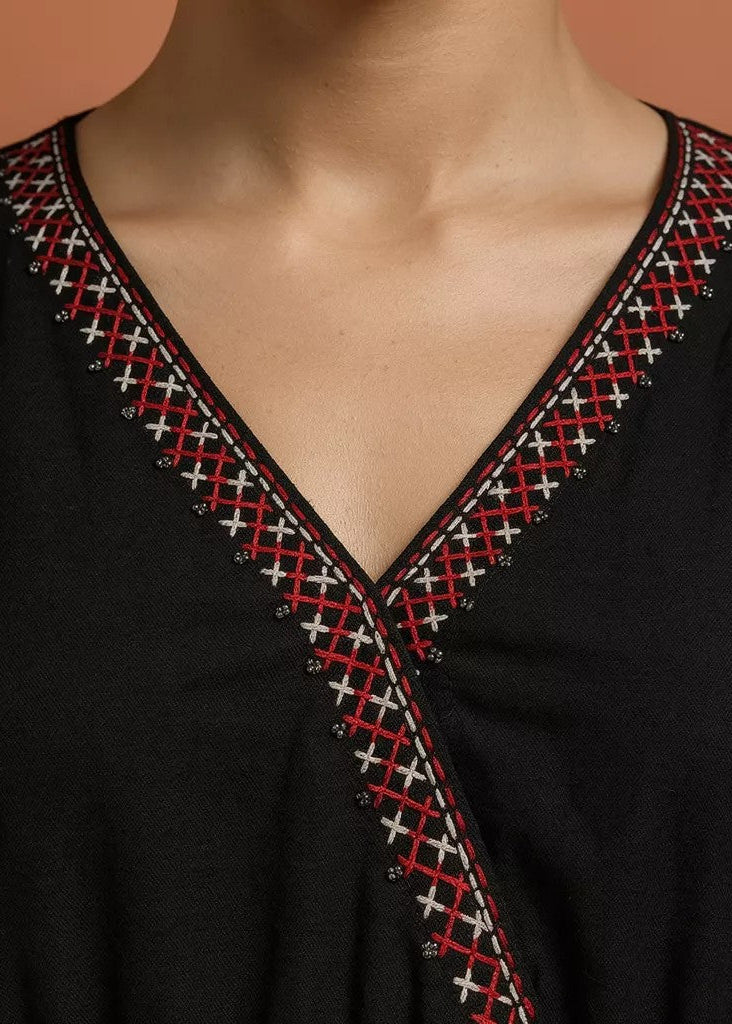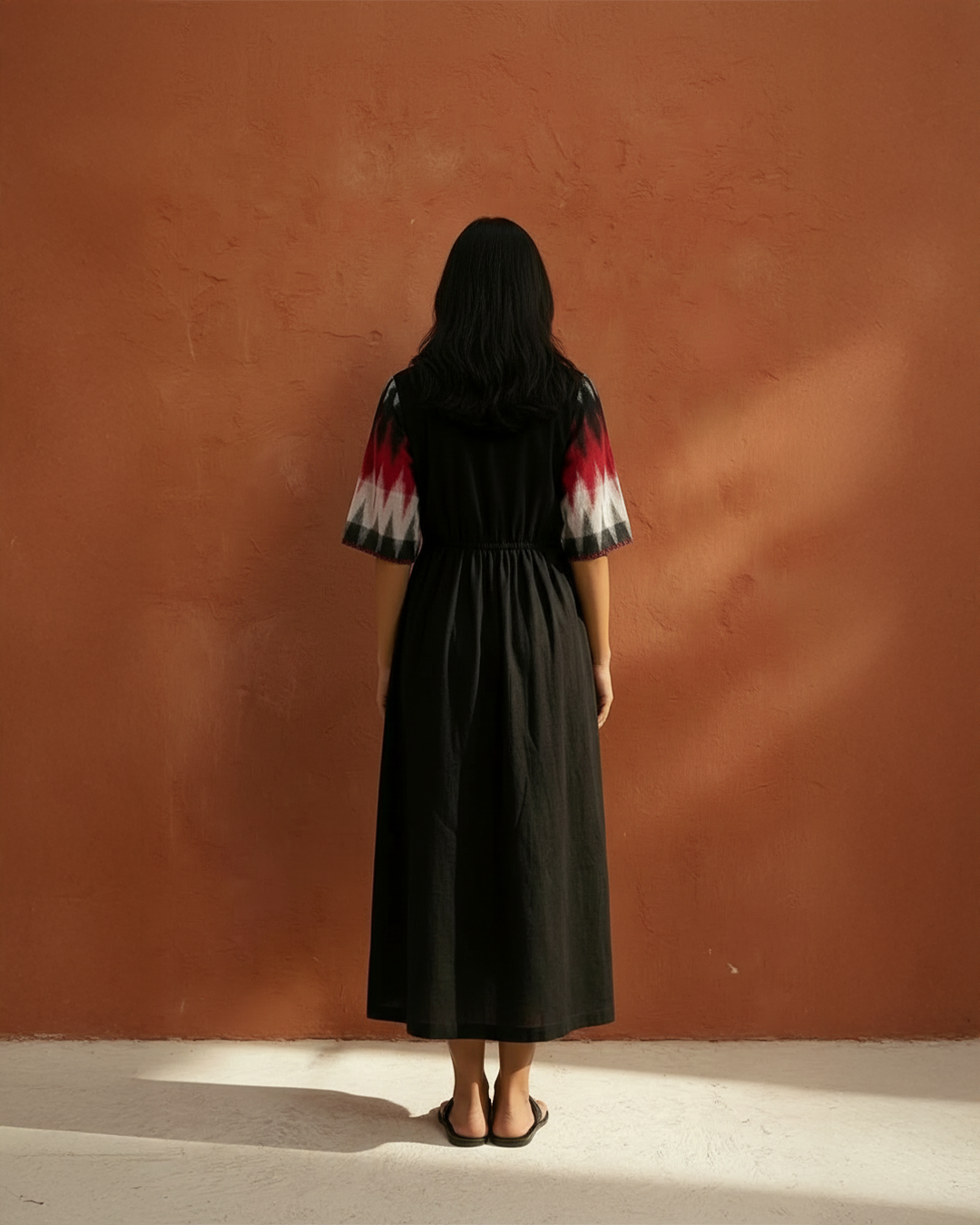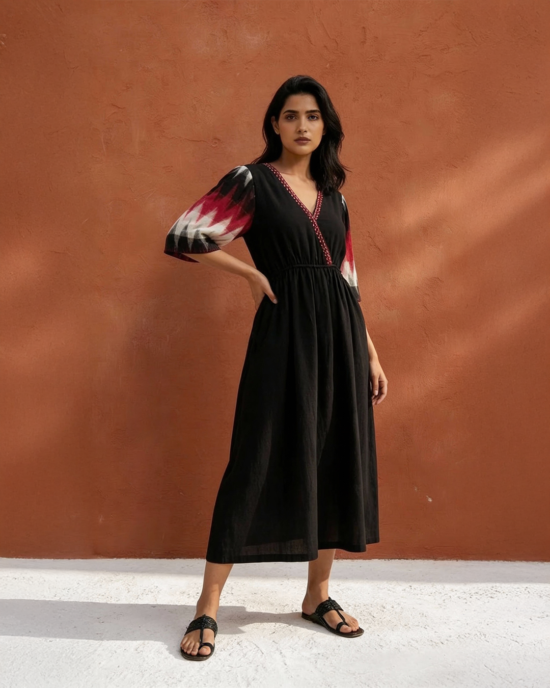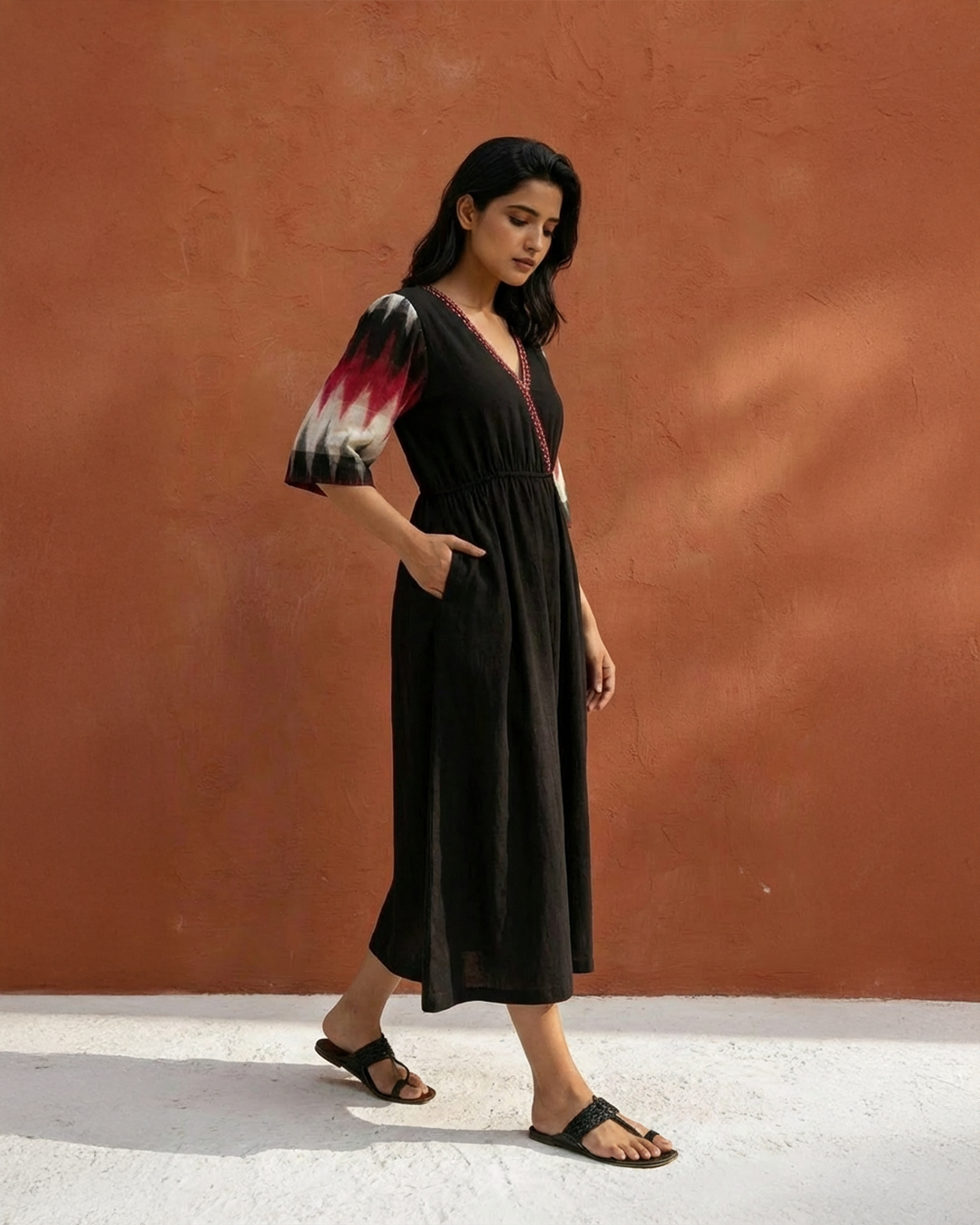 Elevate your everyday style with our Ikat Fusion Black Midi Dress, designed to bring together bold patterns and timeless sophistication. Featuring a flattering overlap V-neckline enhanced with intricate thread detailing, this dress strikes the perfect balance between traditional craftsmanship and modern aesthetics.