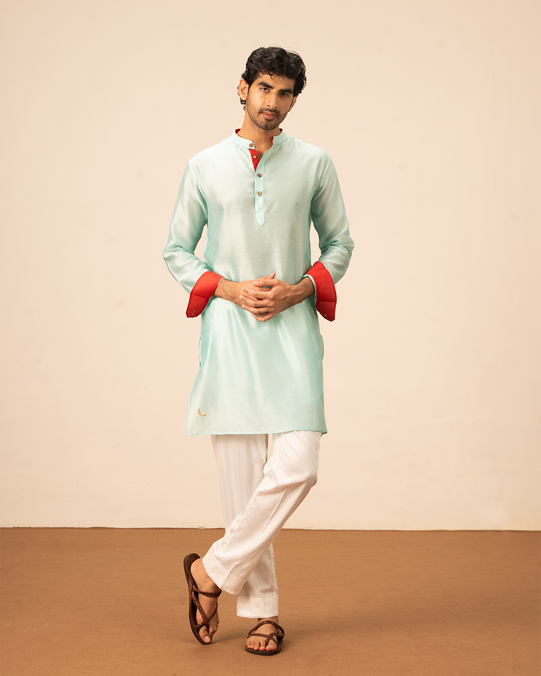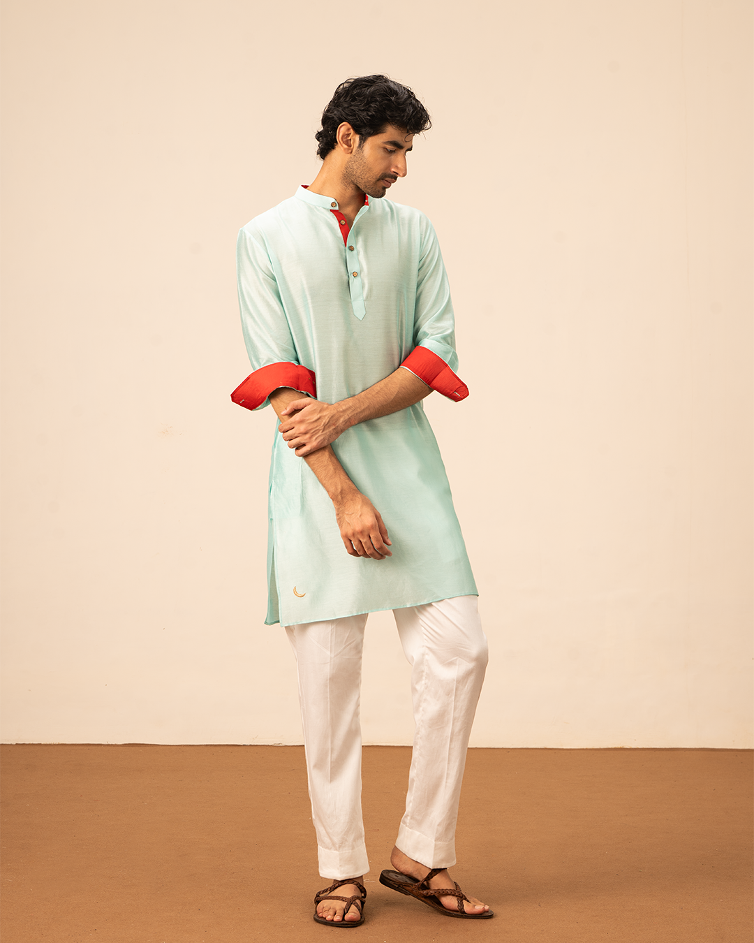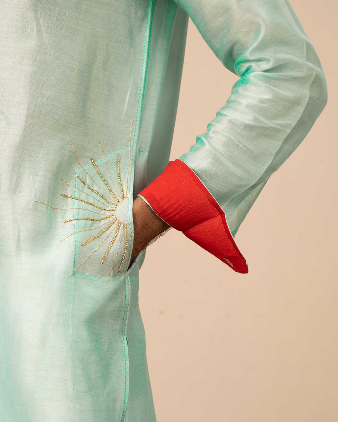 Elevate your wardrobe with the Kaia Men's Kurta Set, featuring a striking red placket lining with a button-up neckline and practical side pockets. Delicate embroidery adds a touch of refined elegance to the classic silhouette. Crafted for both comfort and style, it’s perfect for festive occasions, cultural events, and evening gatherings. A sophisticated blend of contemporary design and traditional craftsmanship.