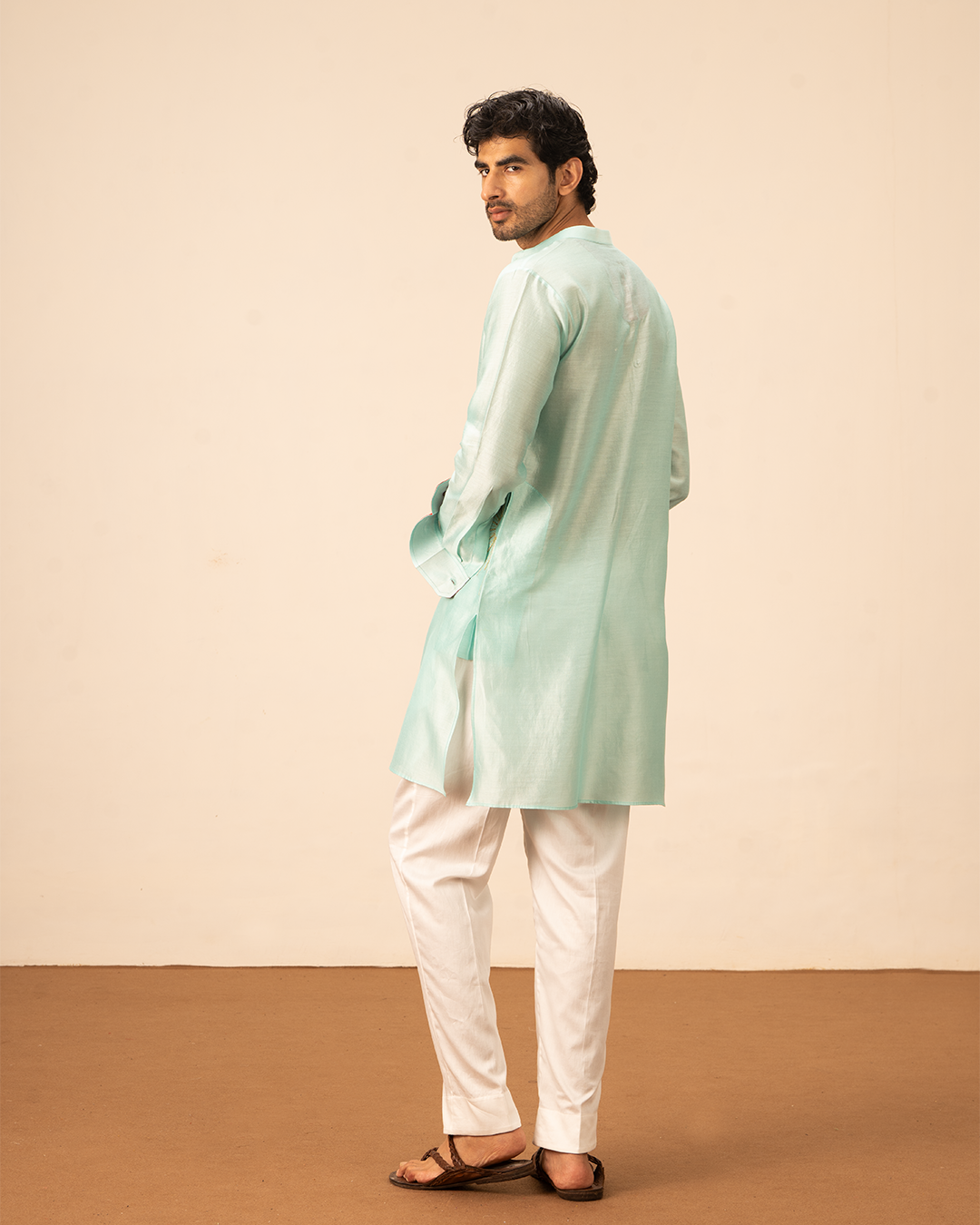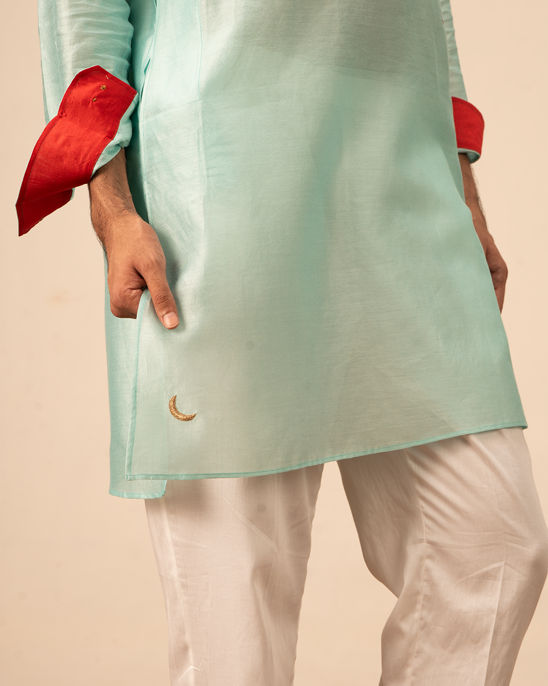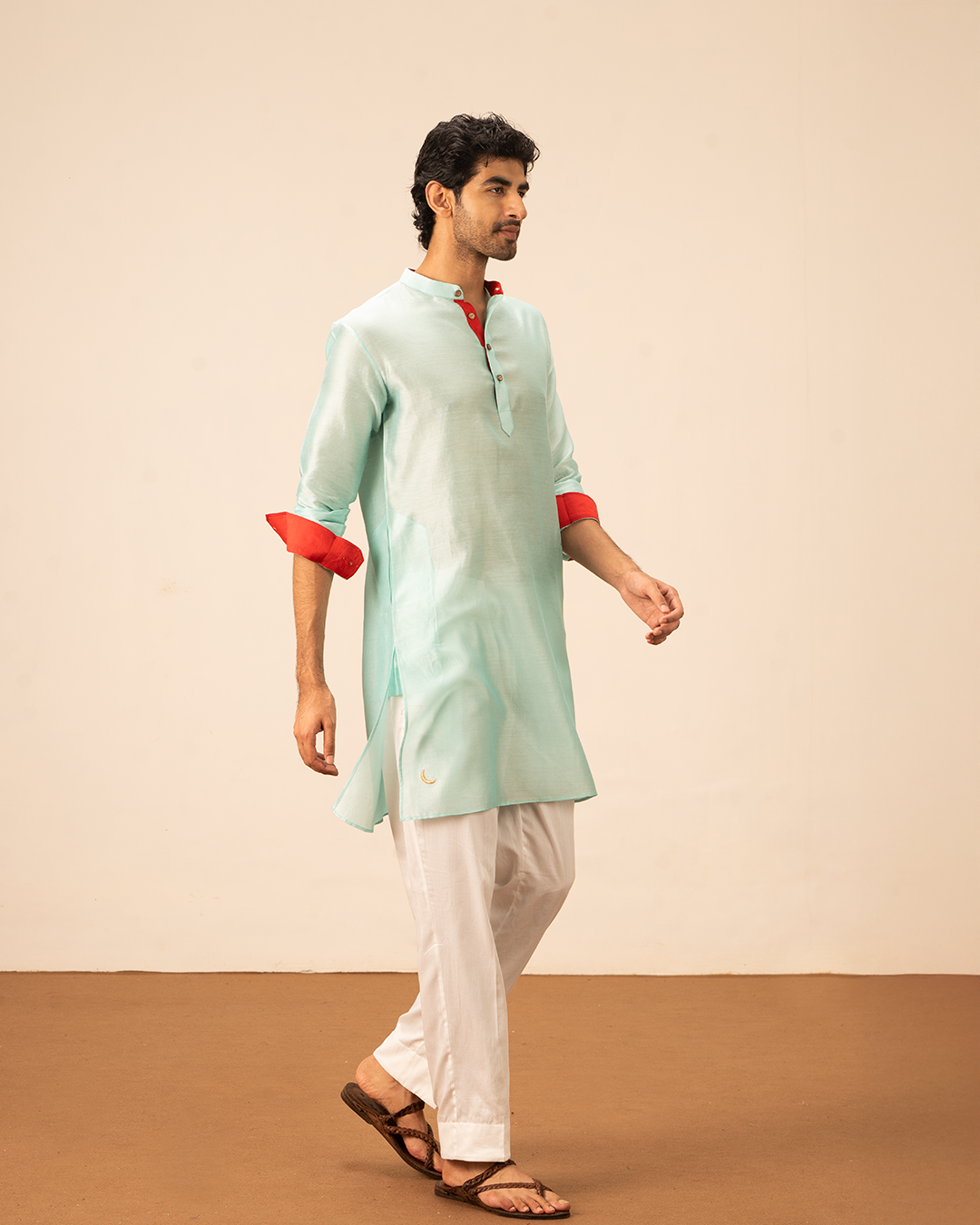 Elevate your wardrobe with the Kaia Men's Kurta Set, featuring a striking red placket lining with a button-up neckline and practical side pockets. Delicate embroidery adds a touch of refined elegance to the classic silhouette. Crafted for both comfort and style, it’s perfect for festive occasions, cultural events, and evening gatherings. A sophisticated blend of contemporary design and traditional craftsmanship.