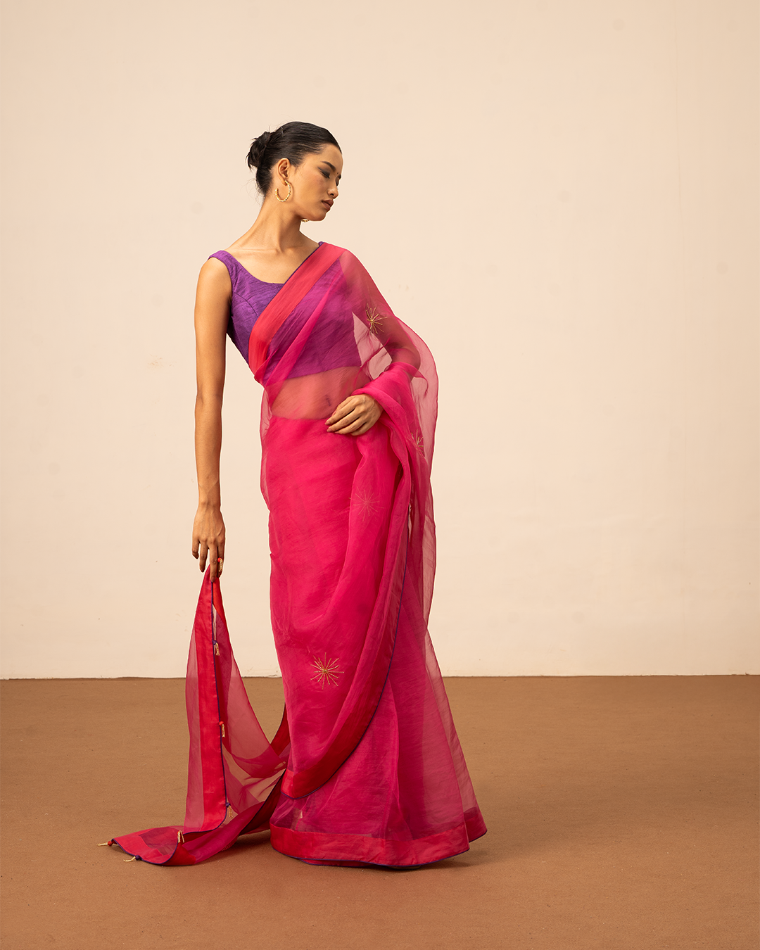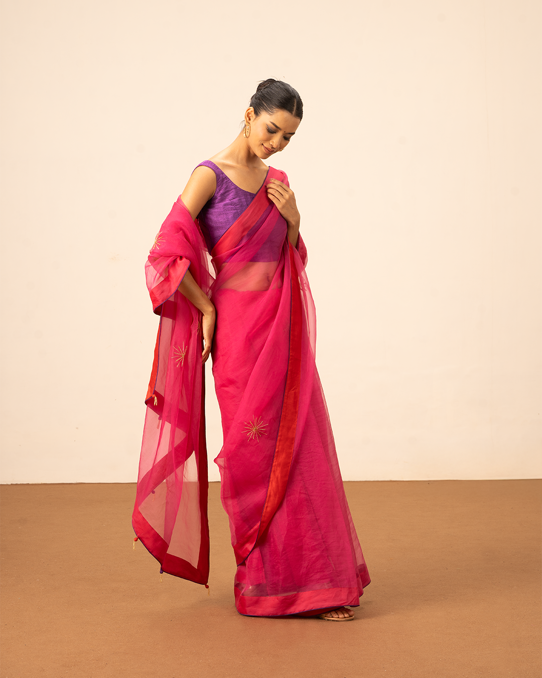 Make a statement with the Nova Saree, featuring sunray-inspired motifs and playful tassel accents. The saree showcases a contrasting red border with purple piping, adding a contemporary edge. Lightweight and gracefully draped in pure organza silk, it exudes effortless sophistication. Perfect for festive occasions, evening events, and modern celebrations, this saree blends traditional craftsmanship with bold, modern design.