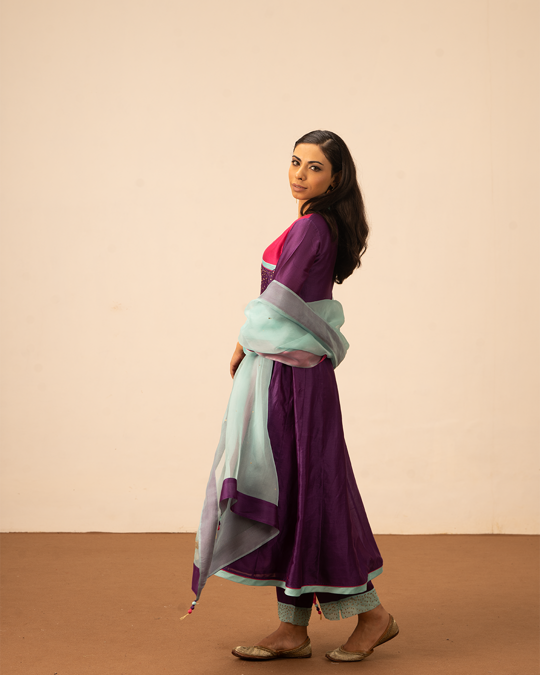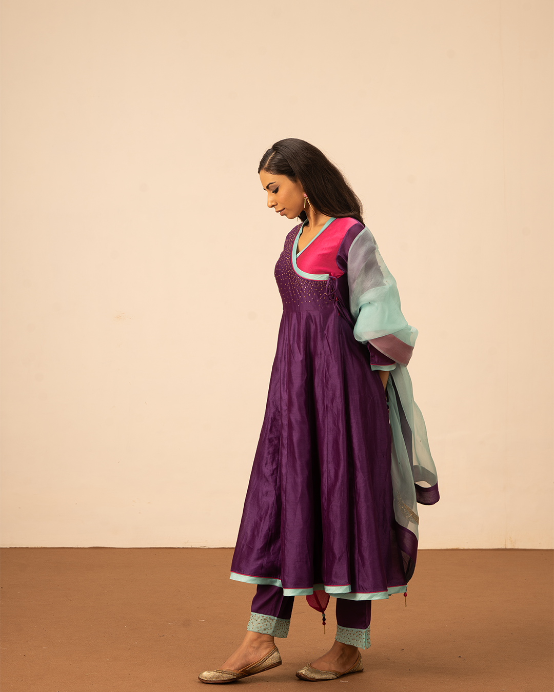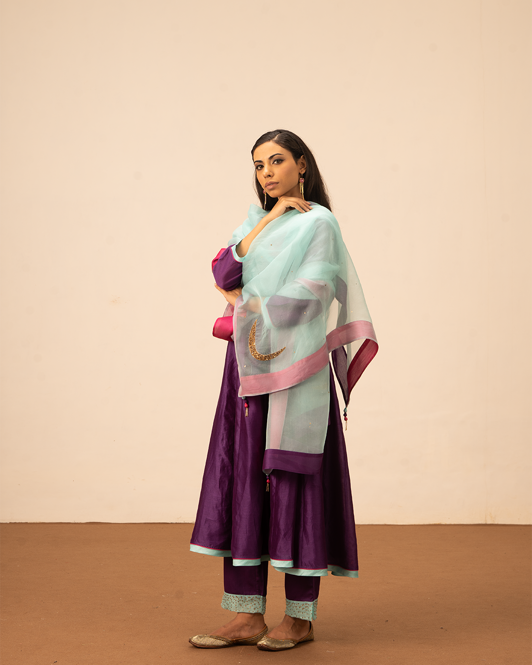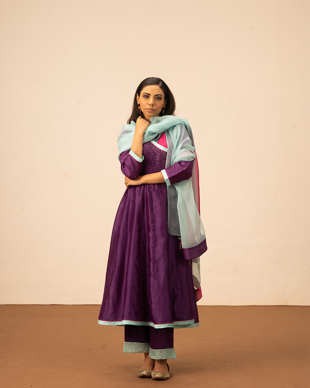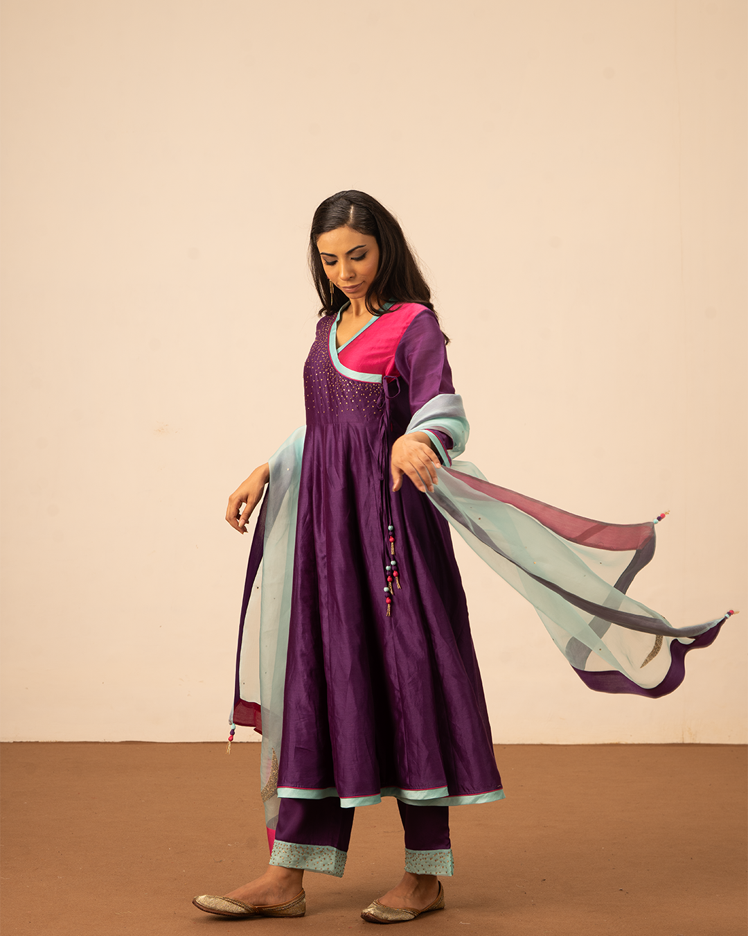 Elevate your festive wardrobe with the Orin Angrakha Kurta Set, featuring pure chanderi angrakha wrap-around kurta and complementing purple pants and a flowing blue pure organza silk dupatta. Thoughtful details, including pink and purple accents, hand embroidery, and a flattering flare, add subtle sophistication. Crafted for comfort and style, this ensemble exudes effortless elegance. Perfect for festive occasions, evening gatherings, and cultural celebrations, it blends contemporary design with traditional craftsmanship.
