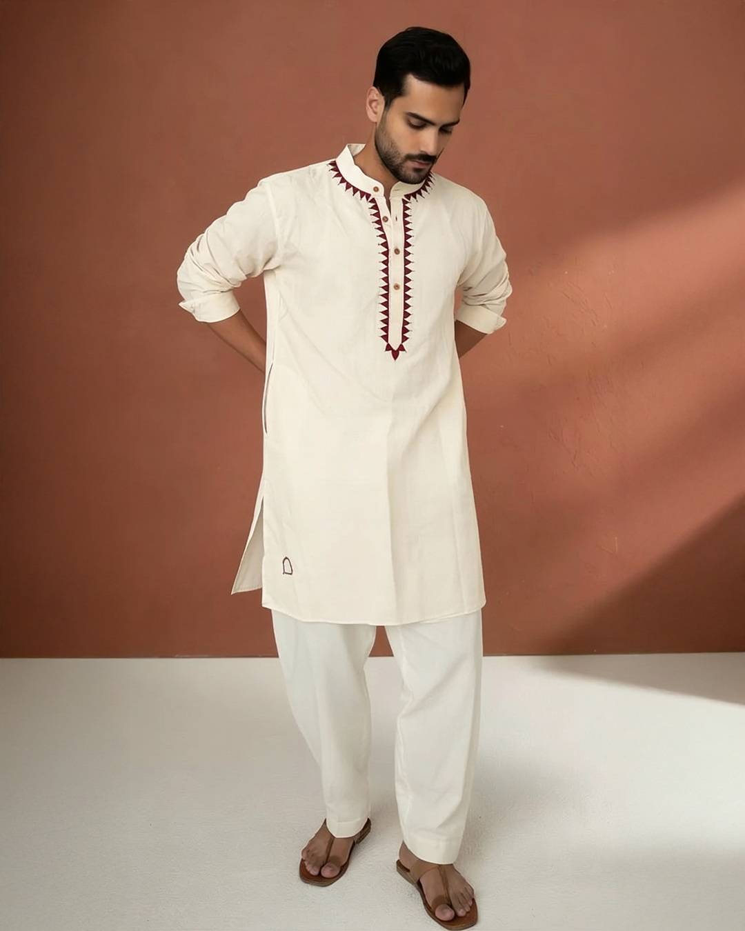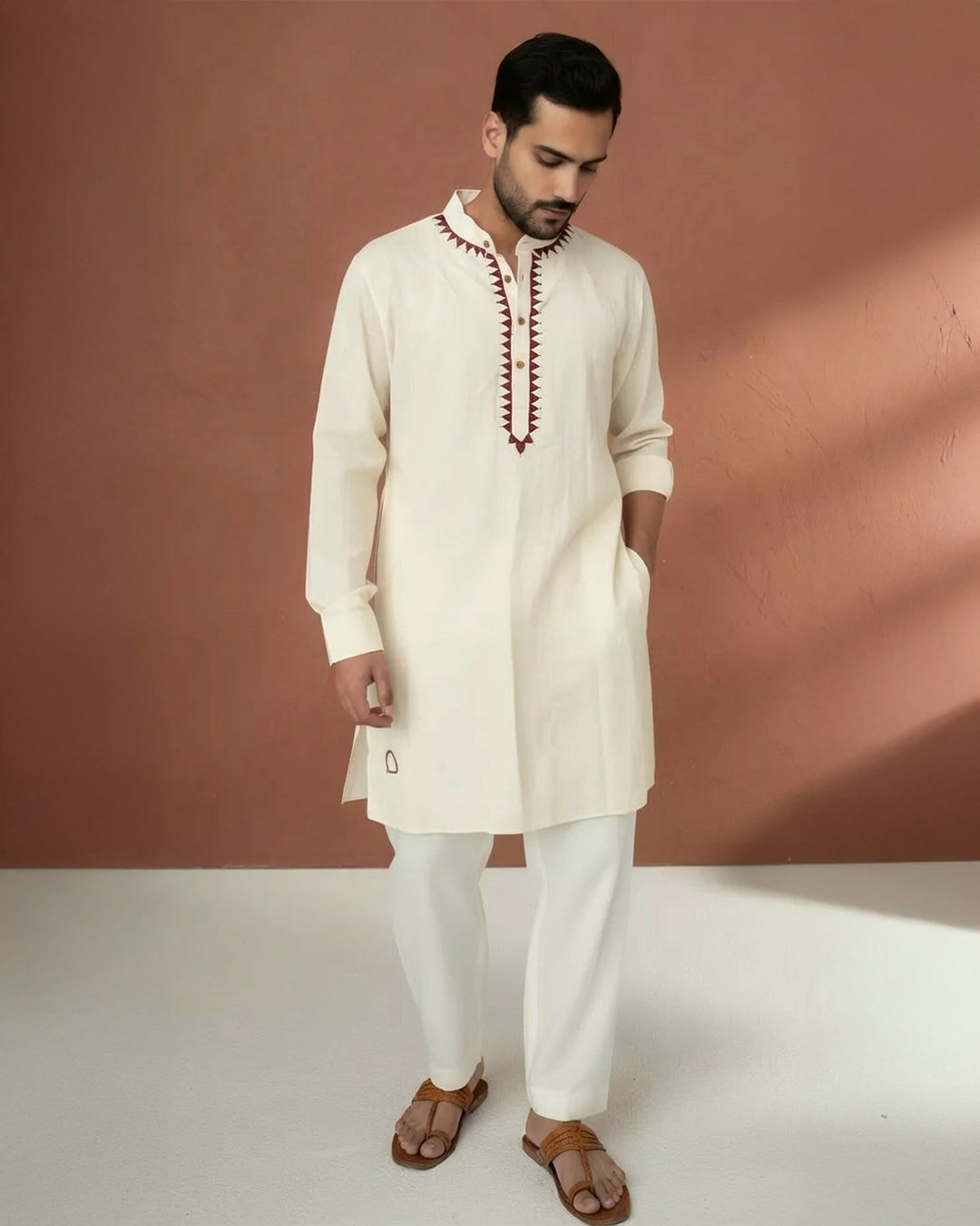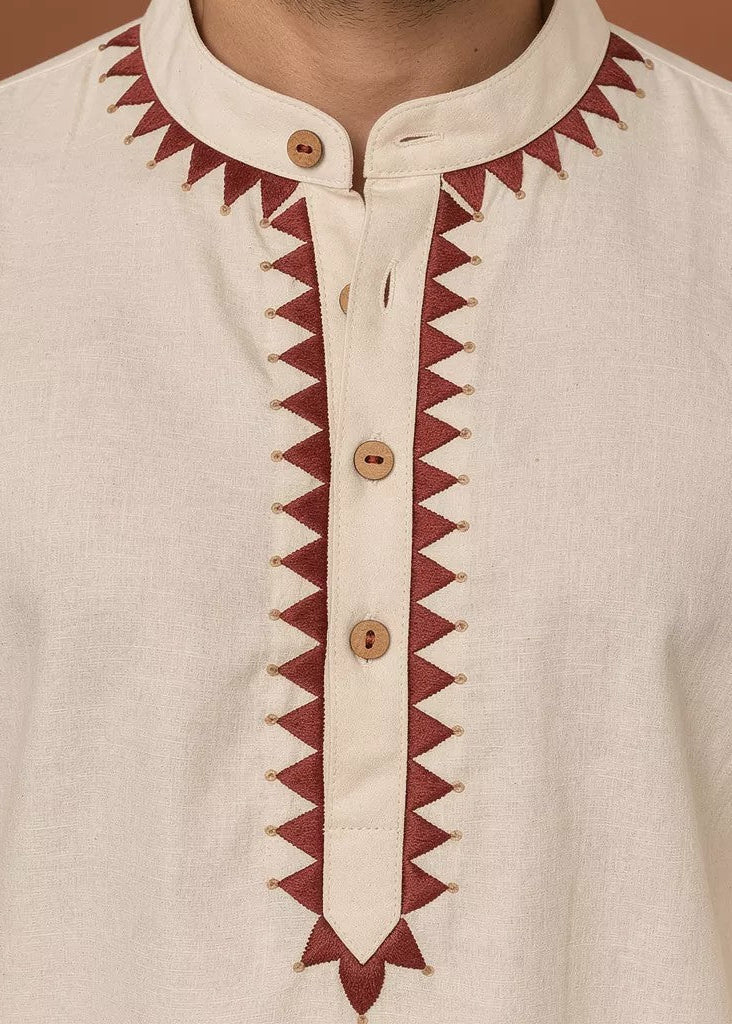 This off white kurta is a wardrobe classic refined with delicate red hand embroidery and golden detailing at the neck. The luxurious handloom cotton fabric keeps it breezy and breathable, making it perfect for warm days, traditional functions and festive events.