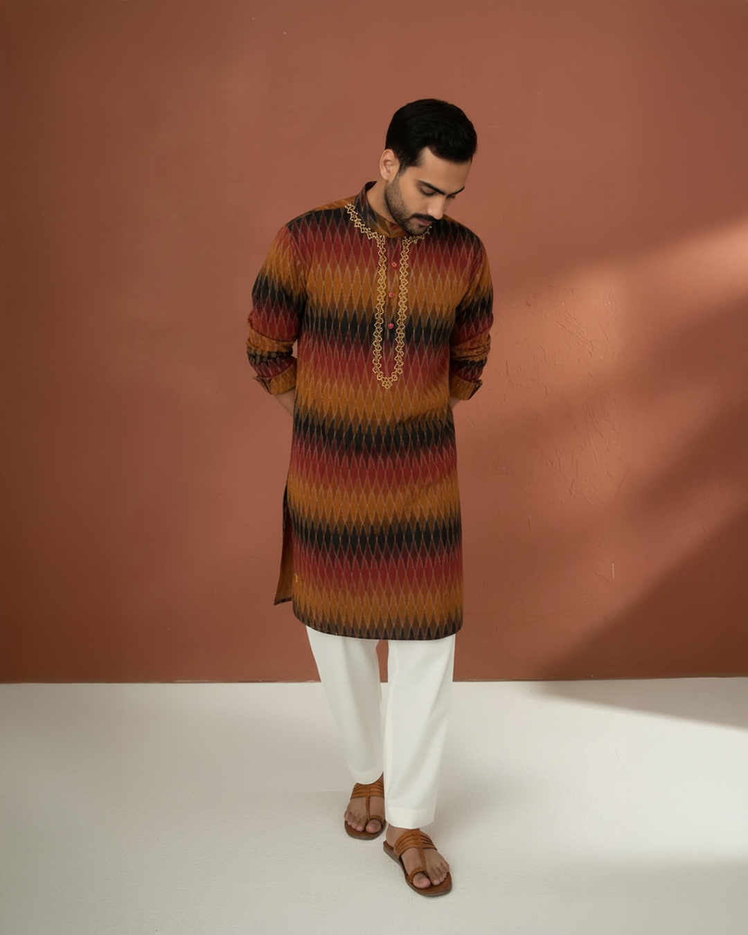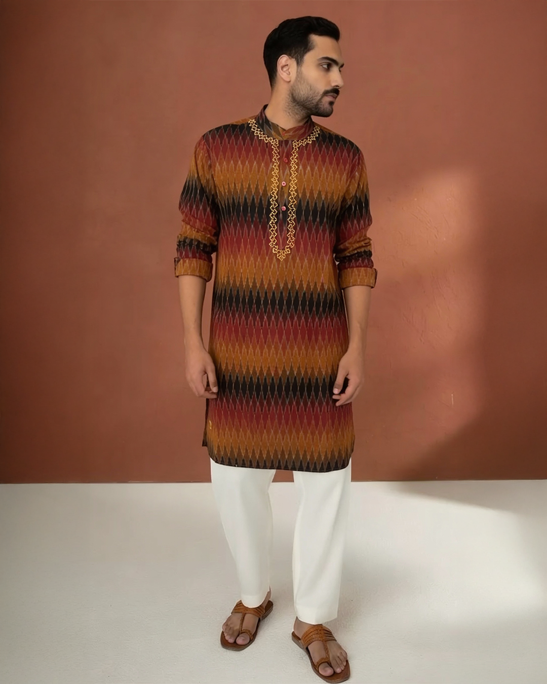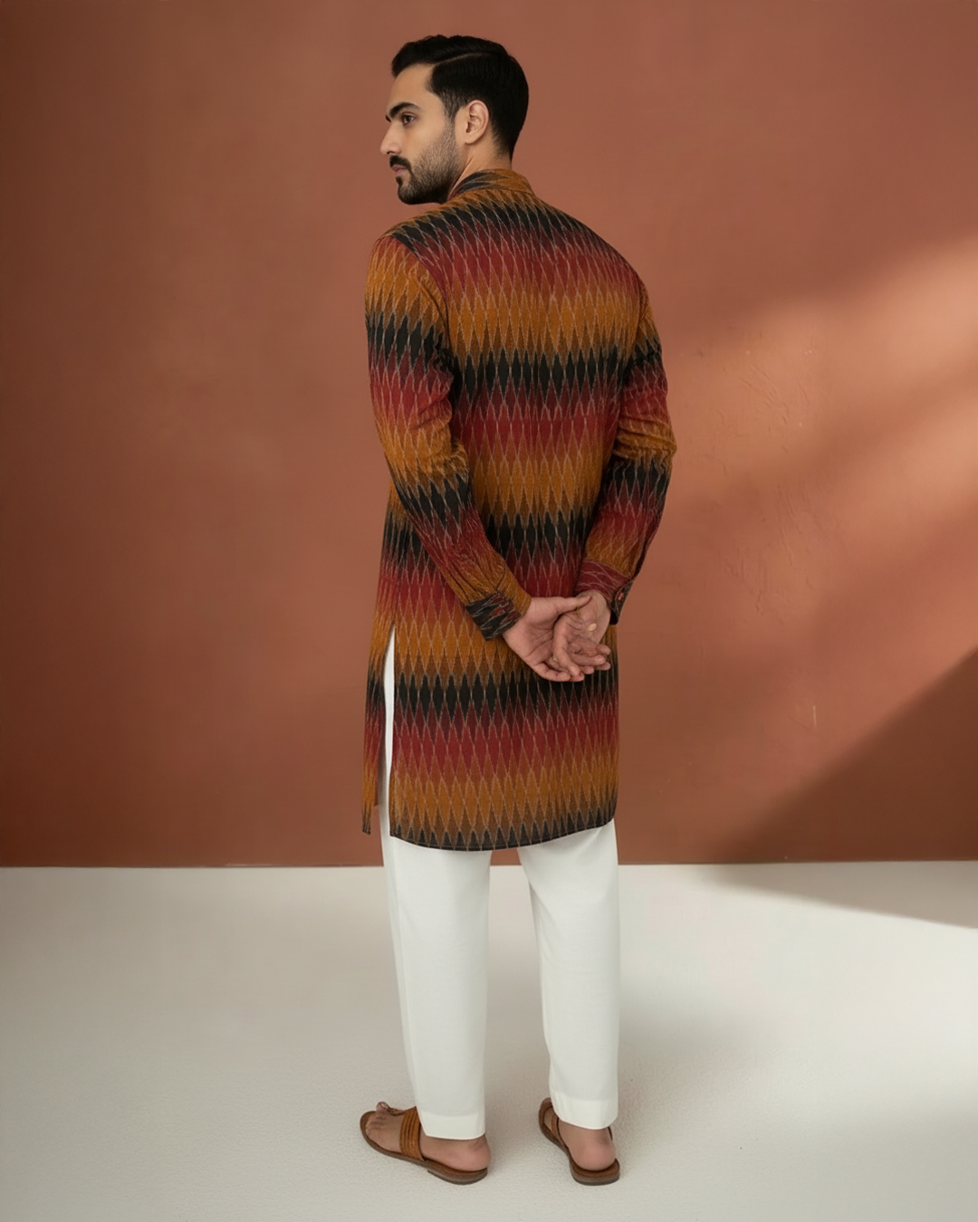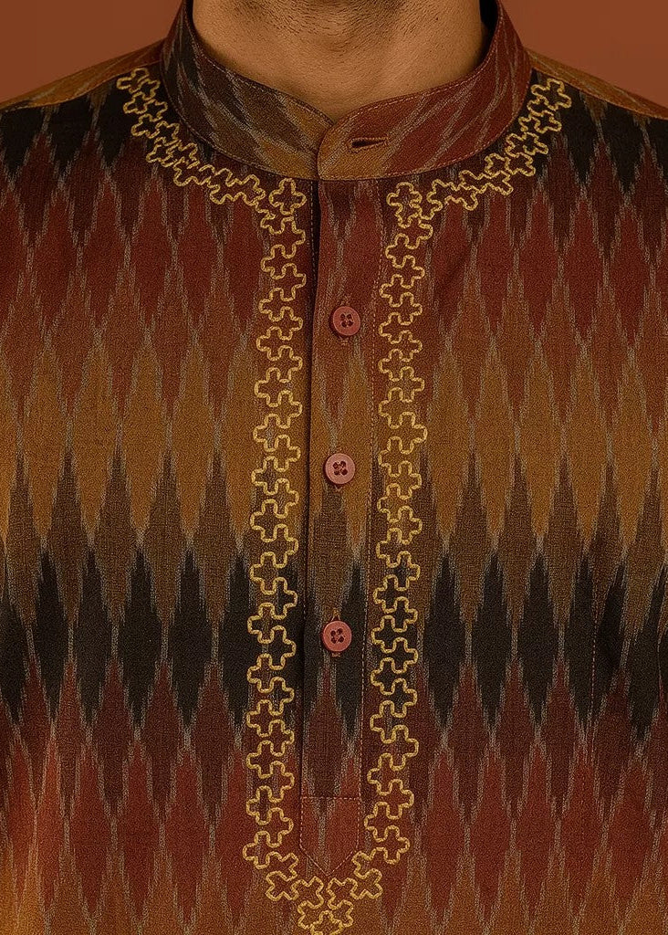 • Kurta: Black with multicolor ikat motifs
