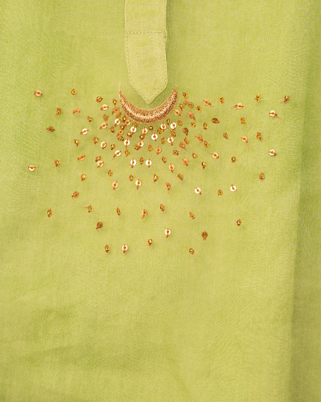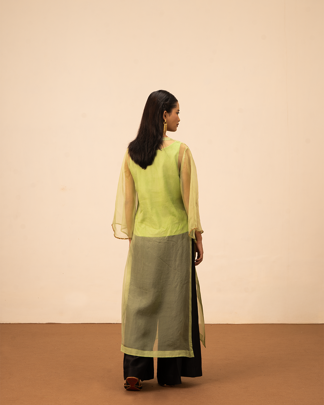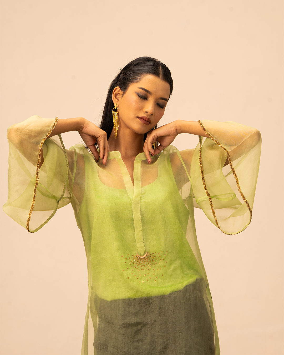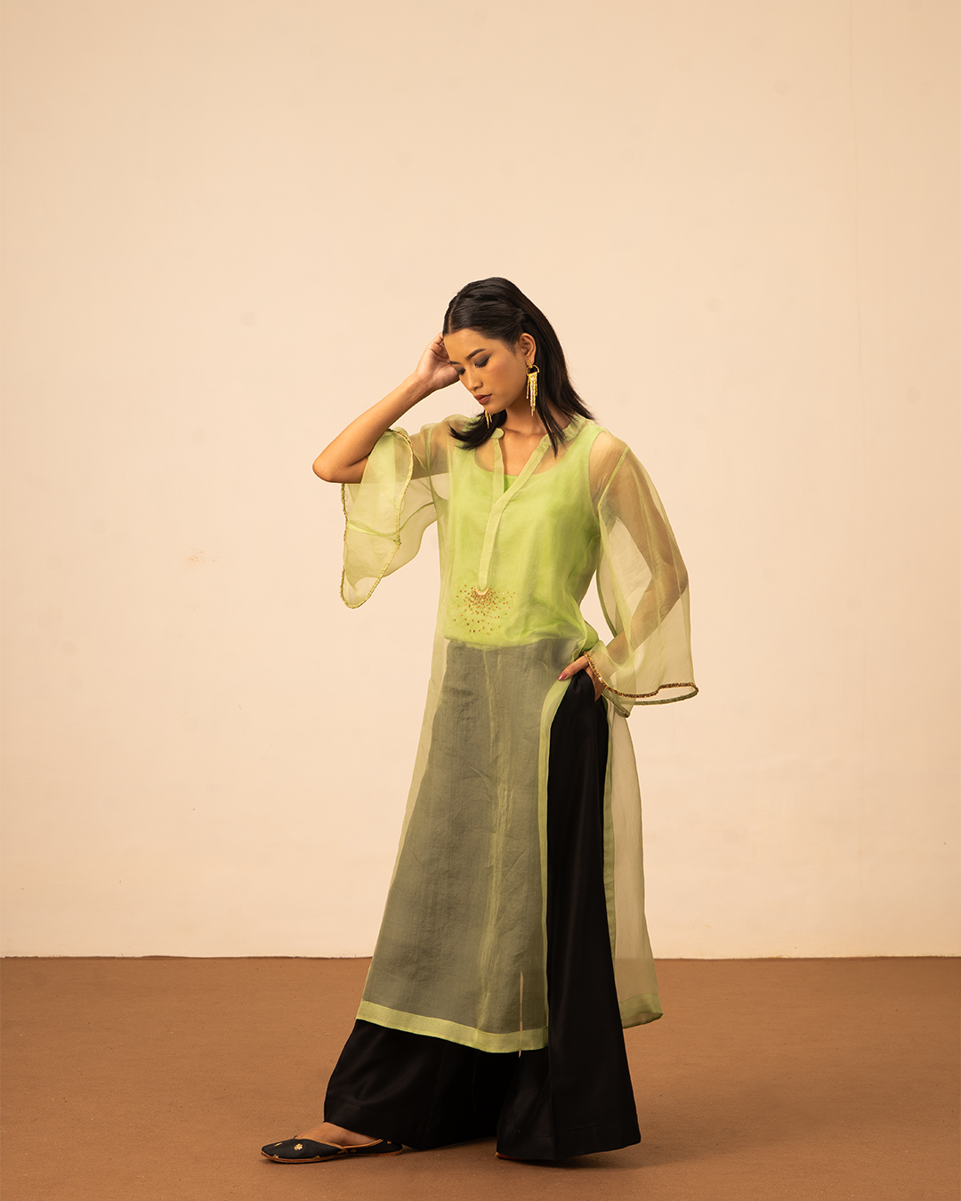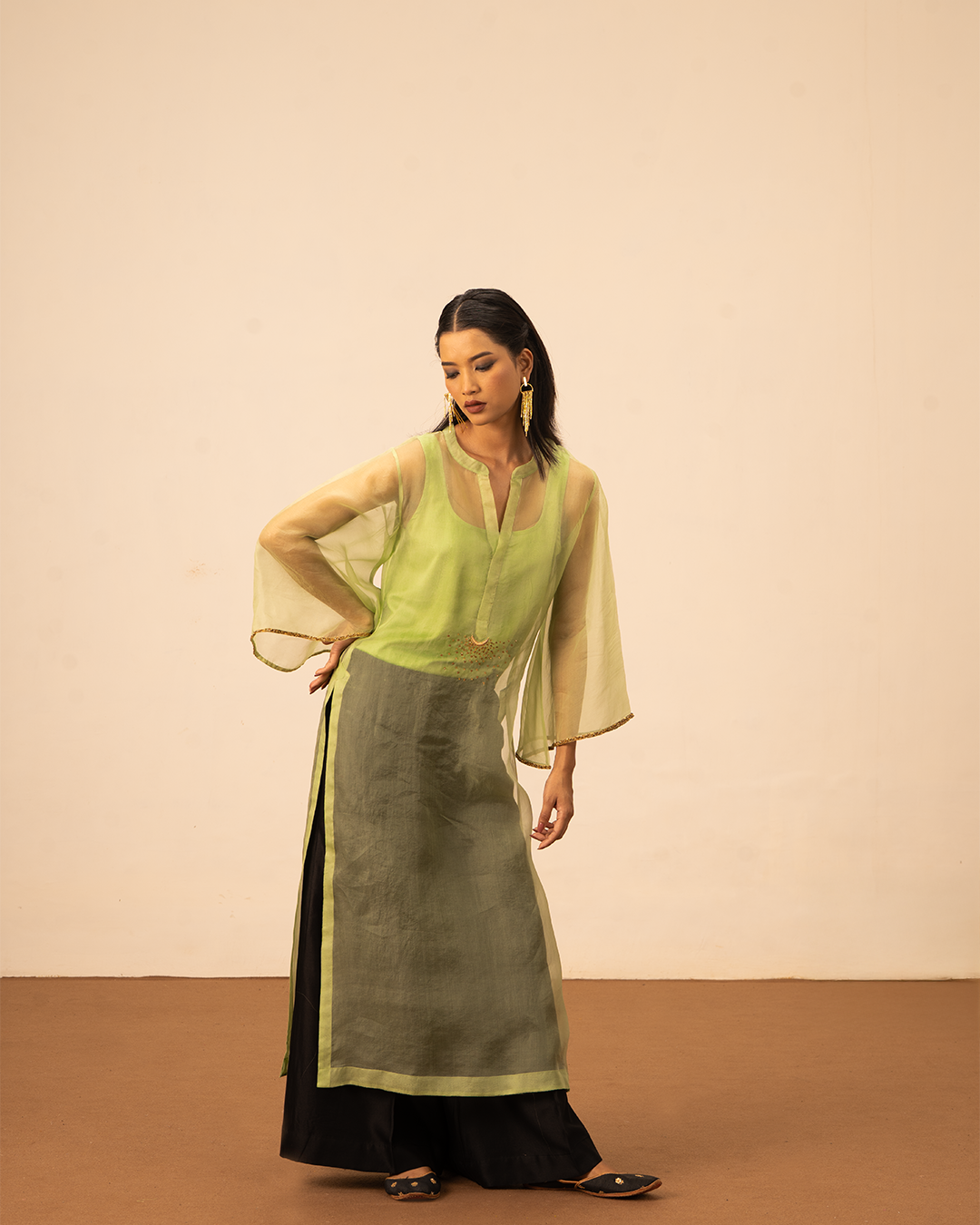 Embrace effortless elegance with Sela Kurta Set, crafted in pure organza silk featuring flared bell sleeves and delicate hand embroidery at the waist. Paired with a soft cotton satin slip-on and contrasting black flared pants in pure chanderi, it offers a graceful, contemporary silhouette. Lightweight and breezy, this ensemble exudes comfort and sophistication. Perfect for festive evenings, celebrations, and cultural gatherings, it beautifully blends modern design with traditional craftsmanship.