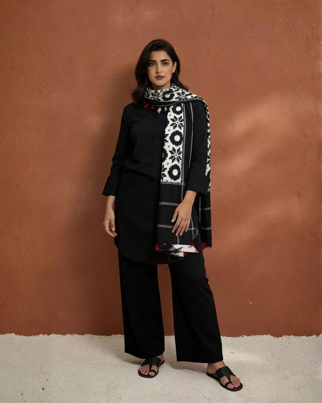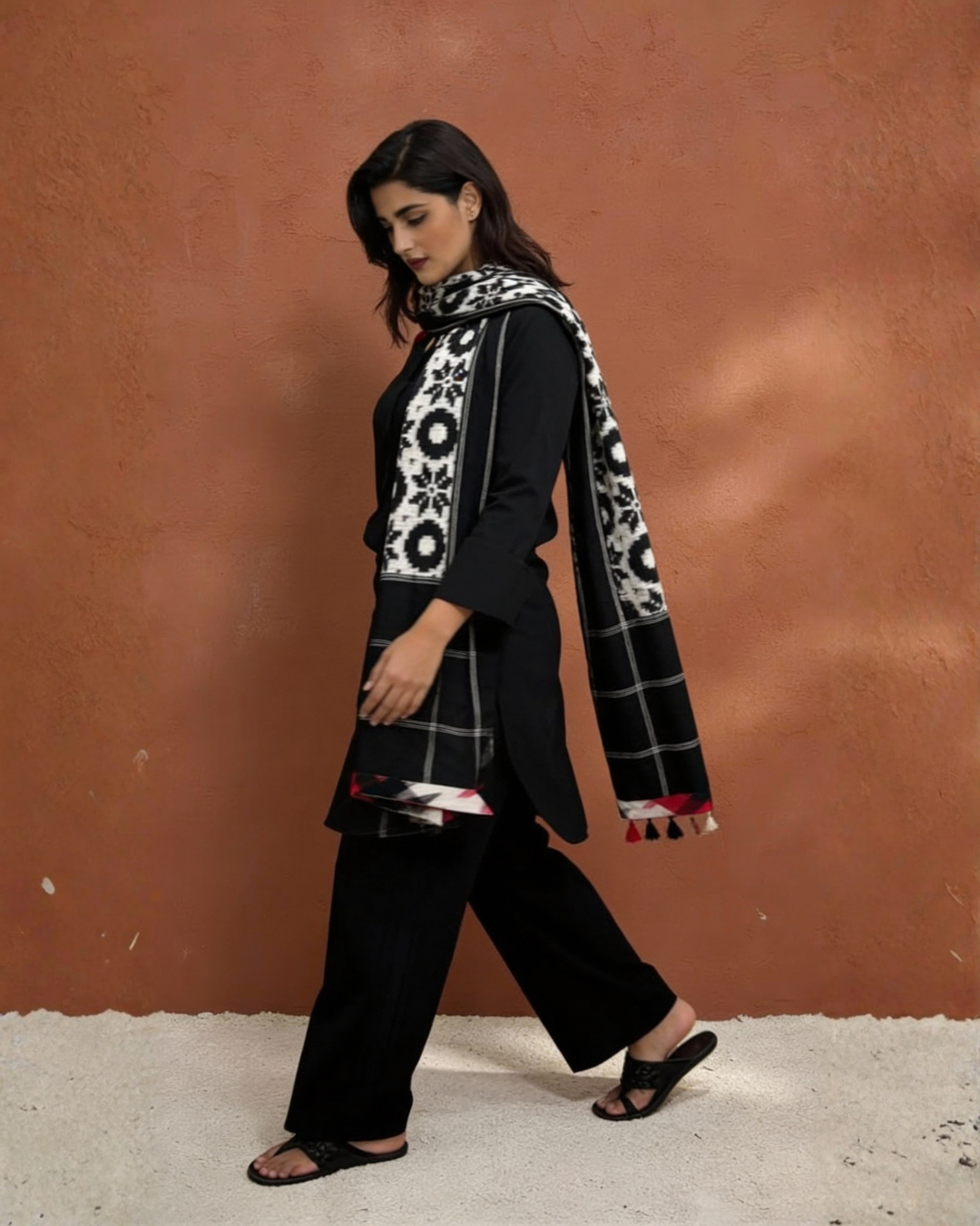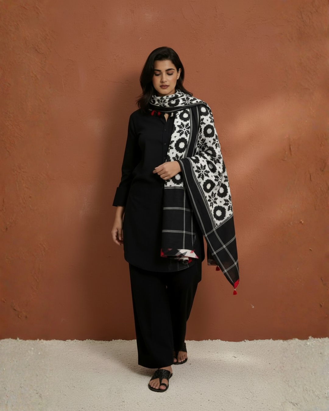 Step into sophisticated style with this striking black kurta set, where classic silhouettes meet bold artisanal expression. The solid black kurta is paired with coordinated bottoms and complemented by a statement ikat dupatta in monochrome tones with subtle red accents. Crafted in breathable, lightweight fabric, this set balances comfort with strong visual appeal, making it ideal for festive gatherings, cultural events, or elevated everyday wear.
