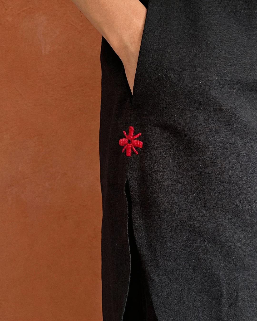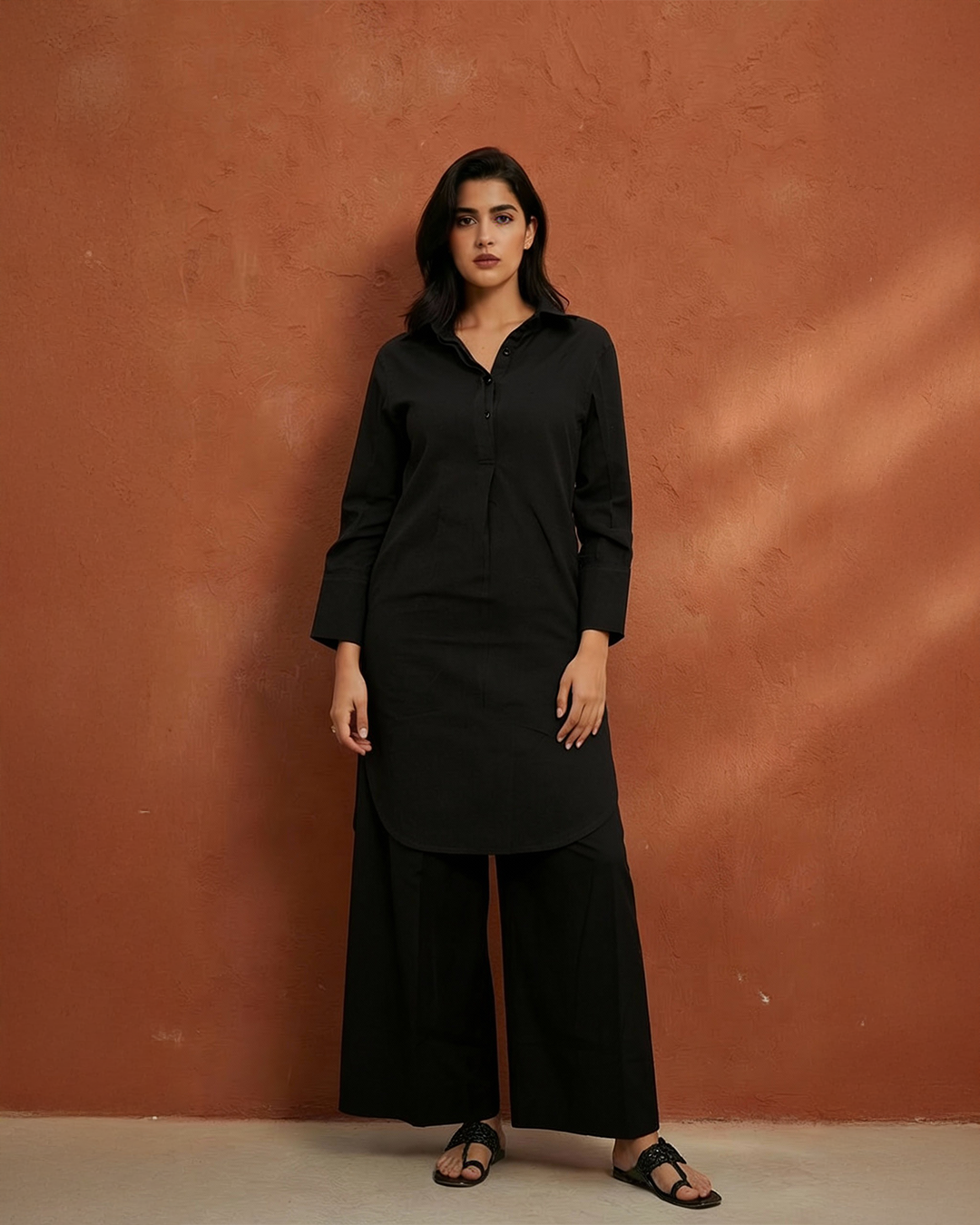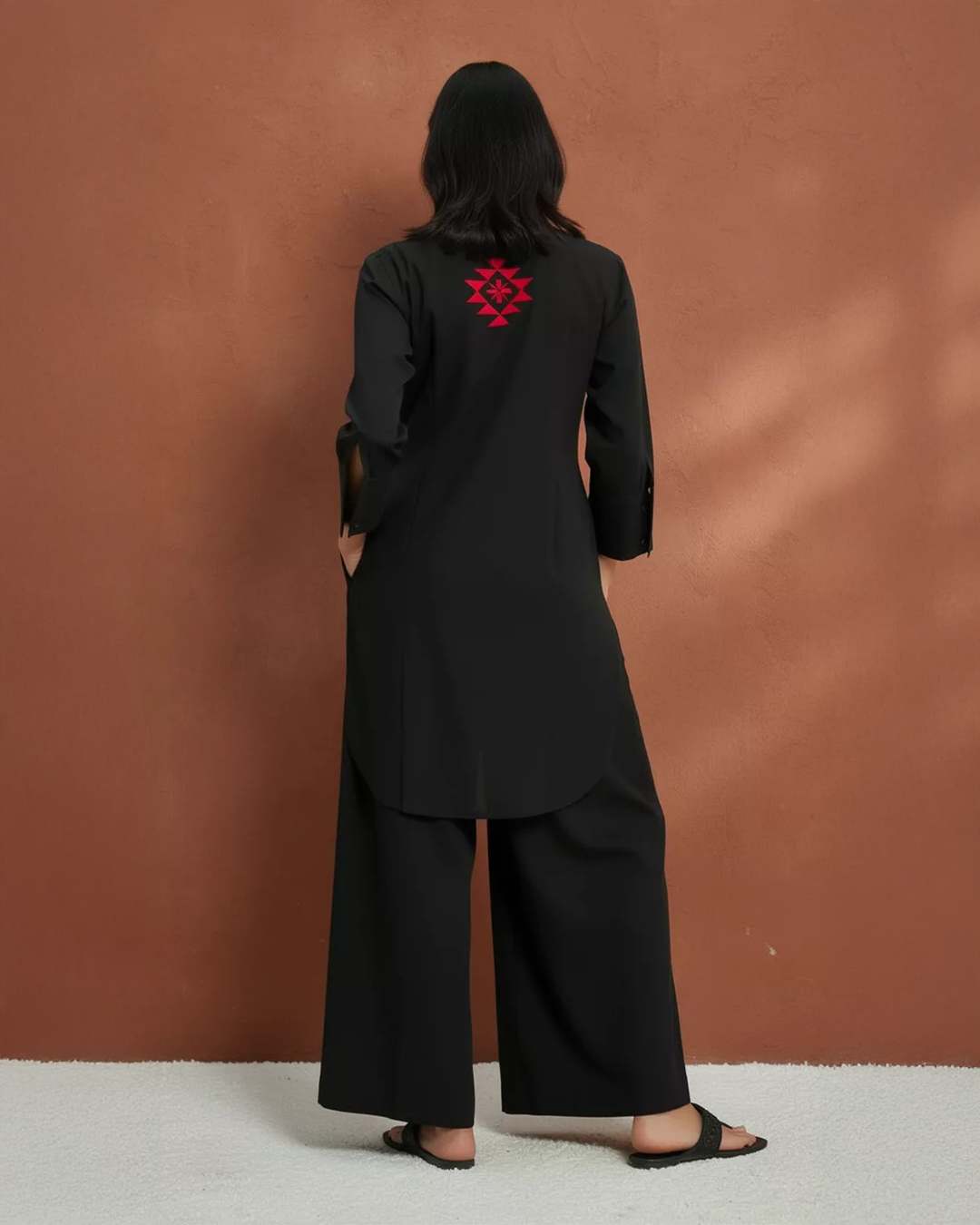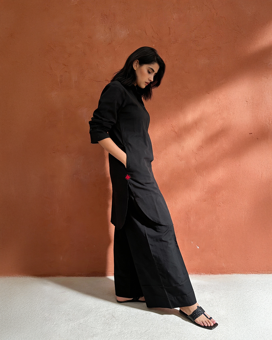 Step into sophisticated style with this striking black kurta set, where classic silhouettes meet bold artisanal expression. The solid black kurta is paired with coordinated bottoms and complemented by a statement ikat dupatta in monochrome tones with subtle red accents. Crafted in breathable, lightweight fabric, this set balances comfort with strong visual appeal, making it ideal for festive gatherings, cultural events, or elevated everyday wear.
