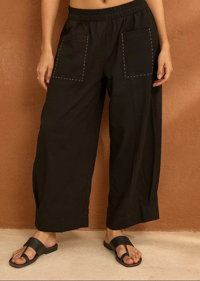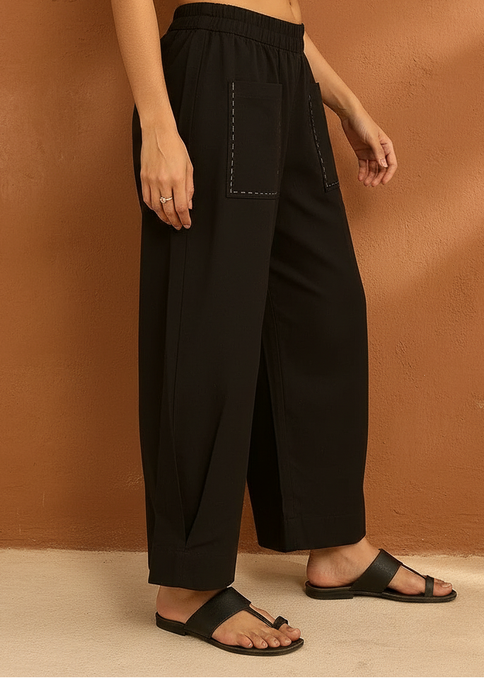 These black straight-fit pants blend comfort with minimal, handcrafted detailing, perfect for everyday wear. Designed with soft breathable fabric and contrast white stitching on the pockets, they add a touch of artisanal charm to your wardrobe. The relaxed silhouette makes them ideal for work, travel, or casual outings. A versatile staple you can pair with kurtas, shirts, or crop tops for effortless style.