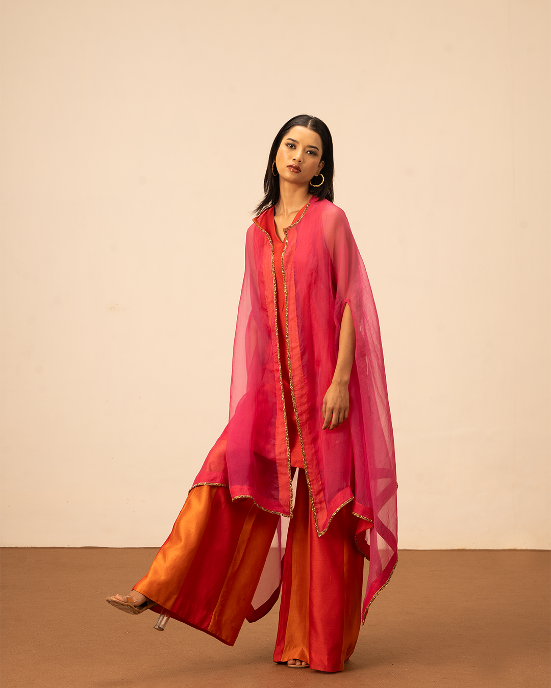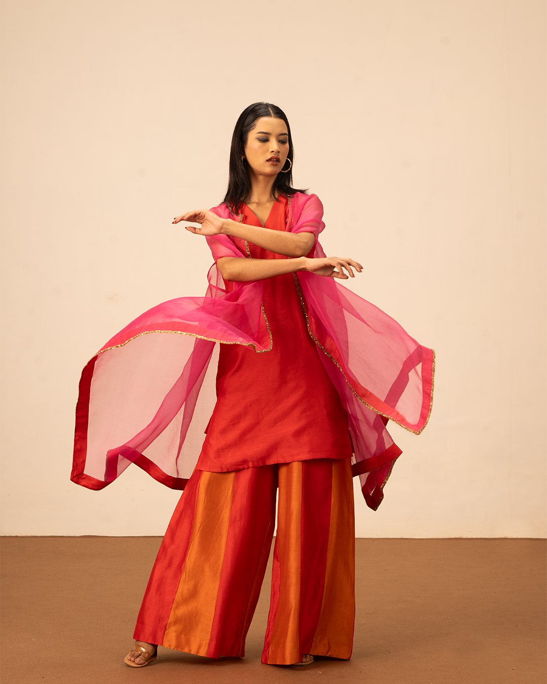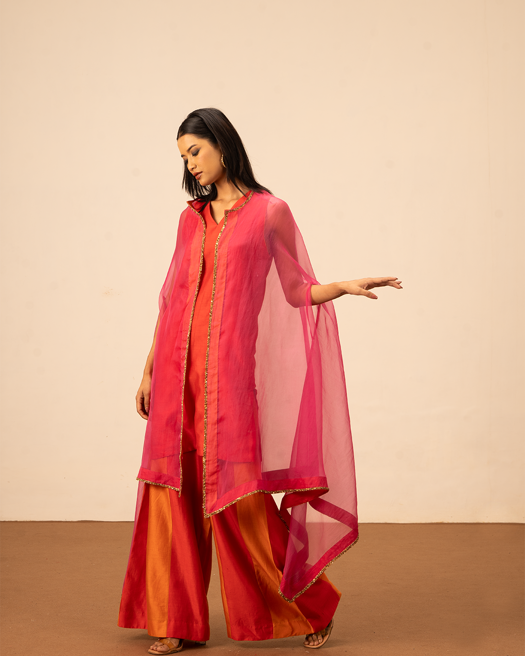 Make a bold statement with the Vira Coord Set, featuring a sleeveless V-neck kurta paired with red-orange narrow striped pants. A sheer pink organza shrug jacket with delicate golden edging completes the ensemble with elegance. Lightweight and breathable, this set offers both comfort and style. Perfect for festive occasions, evening events, and celebratory gatherings, it blends contemporary design with traditional craftsmanship.