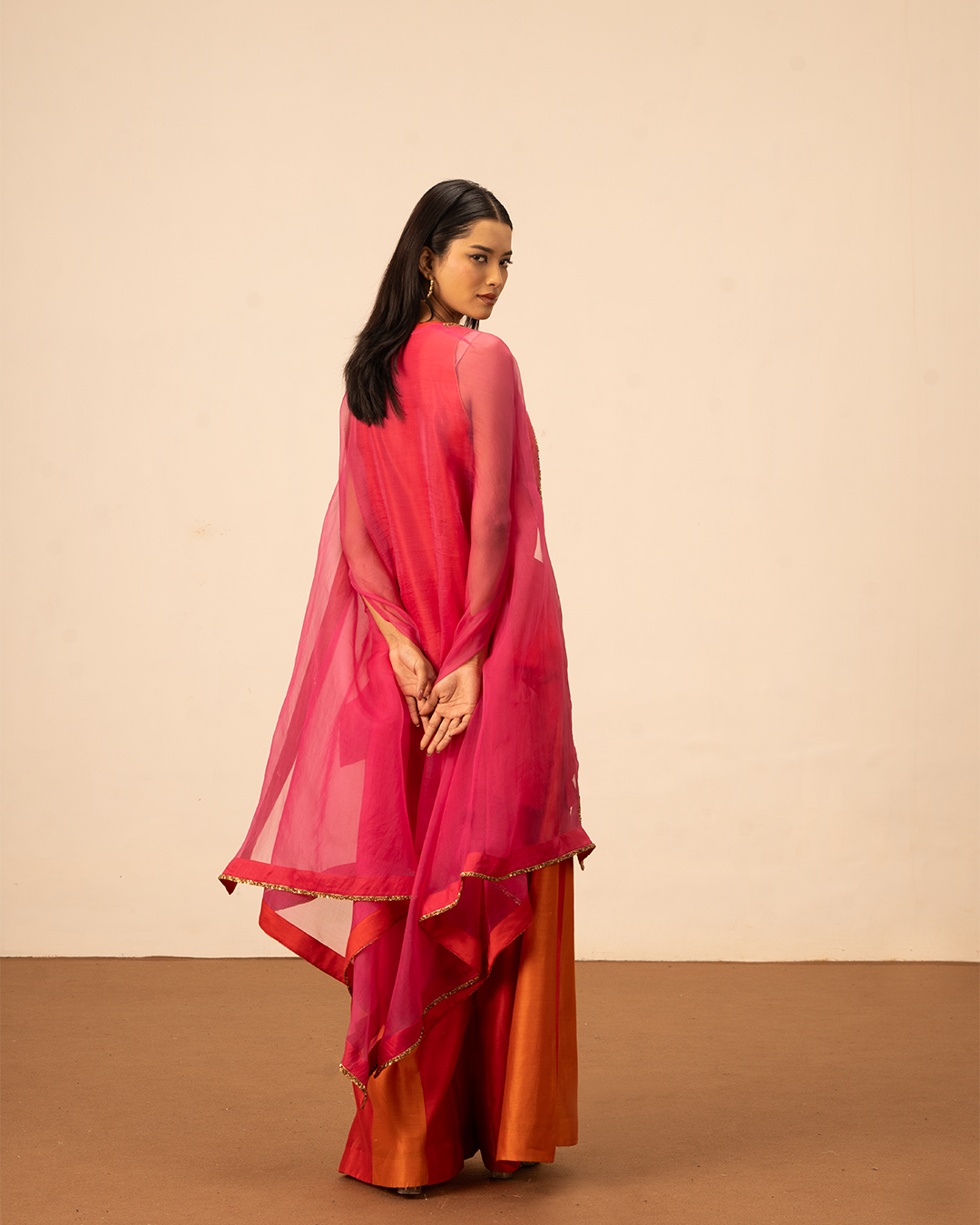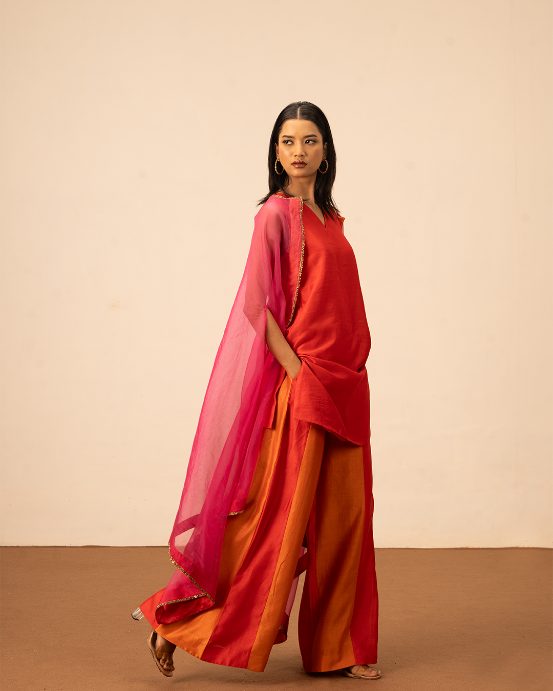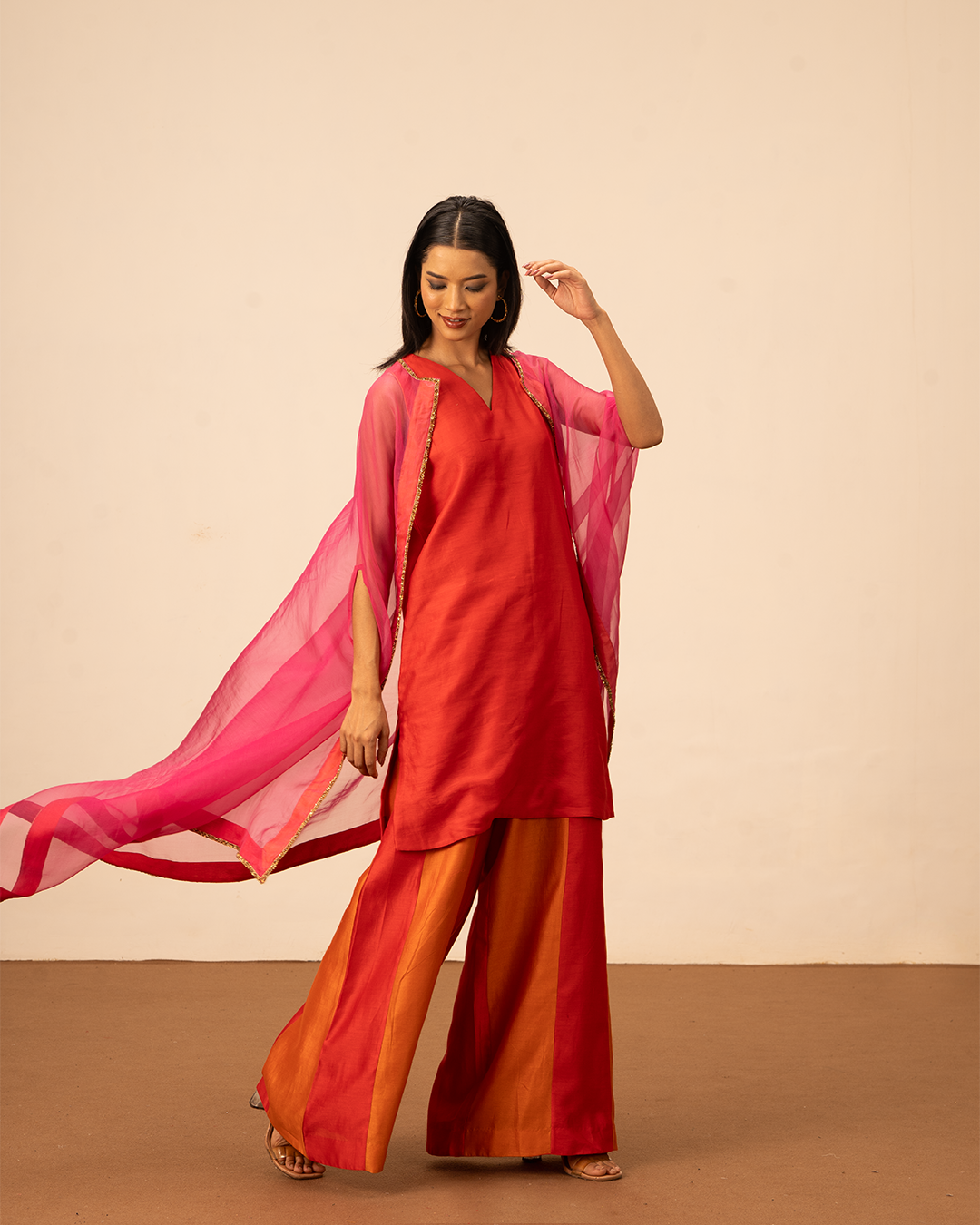 Make a bold statement with the Vira Coord Set, featuring a sleeveless V-neck kurta paired with red-orange narrow striped pants. A sheer pink organza shrug jacket with delicate golden edging completes the ensemble with elegance. Lightweight and breathable, this set offers both comfort and style. Perfect for festive occasions, evening events, and celebratory gatherings, it blends contemporary design with traditional craftsmanship.
