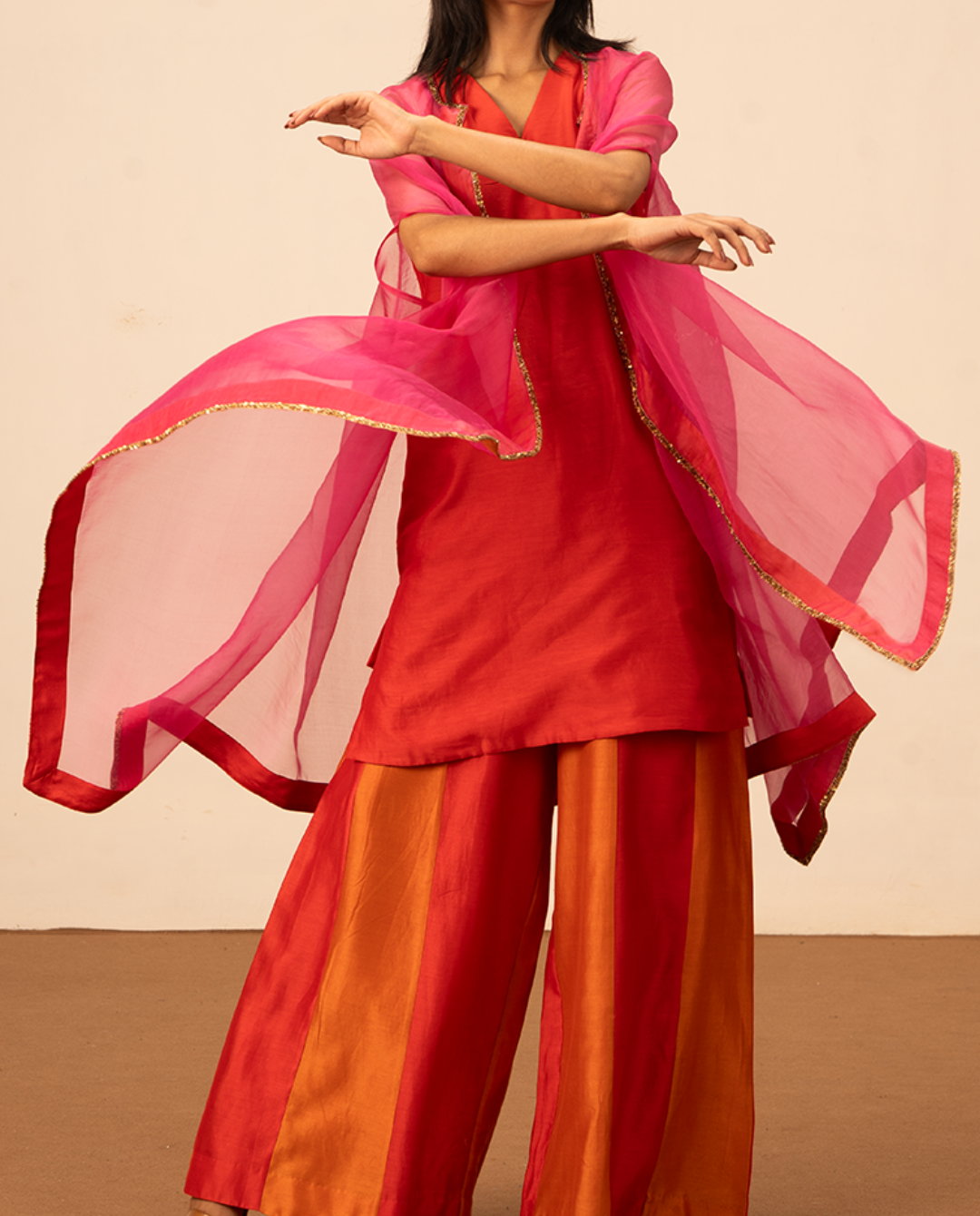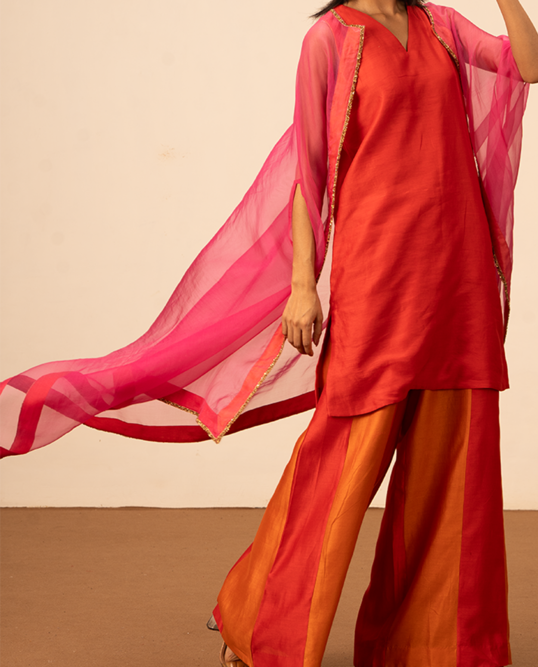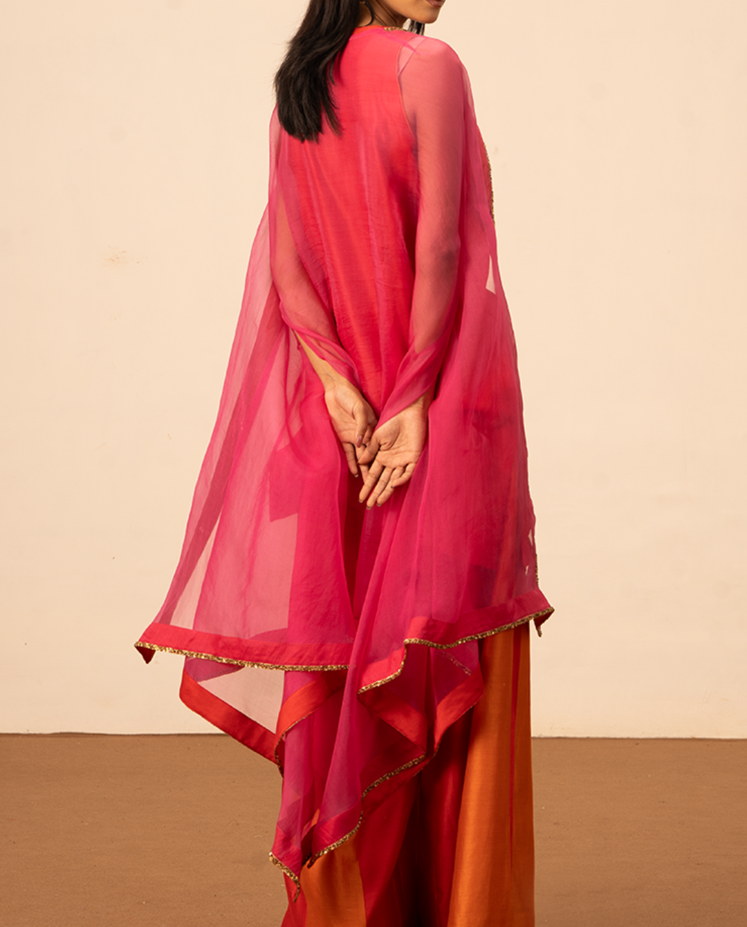 Add a touch of elegance with the Vira Shrug, a sheer pink organza dupatta-shrug featuring delicate golden edging for a subtle shimmer. Lightweight and graceful in pure organza silk, it complements both traditional and contemporary outfits effortlessly. Perfect for festive occasions, evening events, and celebrations, it enhances any ensemble with sophistication. A versatile layering piece that blends style with timeless charm.