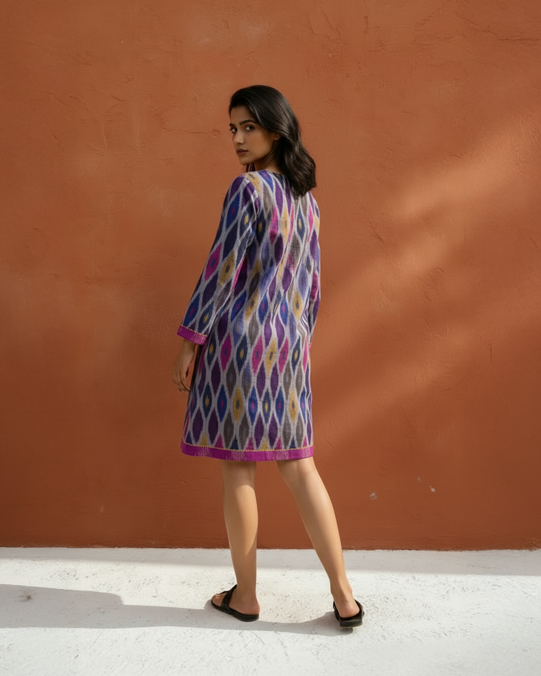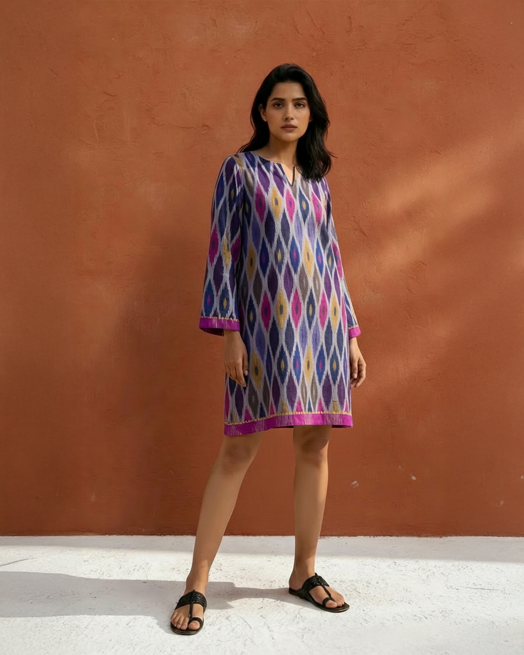 A pop of colour, tradition, and everyday ease - all in one. This multicolour Ikat straight-fit kurta brings together vivid hues and a beautifully handwoven texture. Finished with contrast magenta borders and delicate gold-stitch detailing, it adds a touch of craft to a clean, comfortable silhouette.